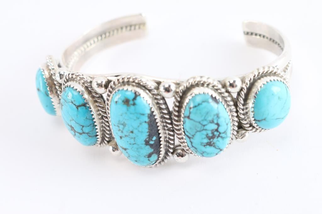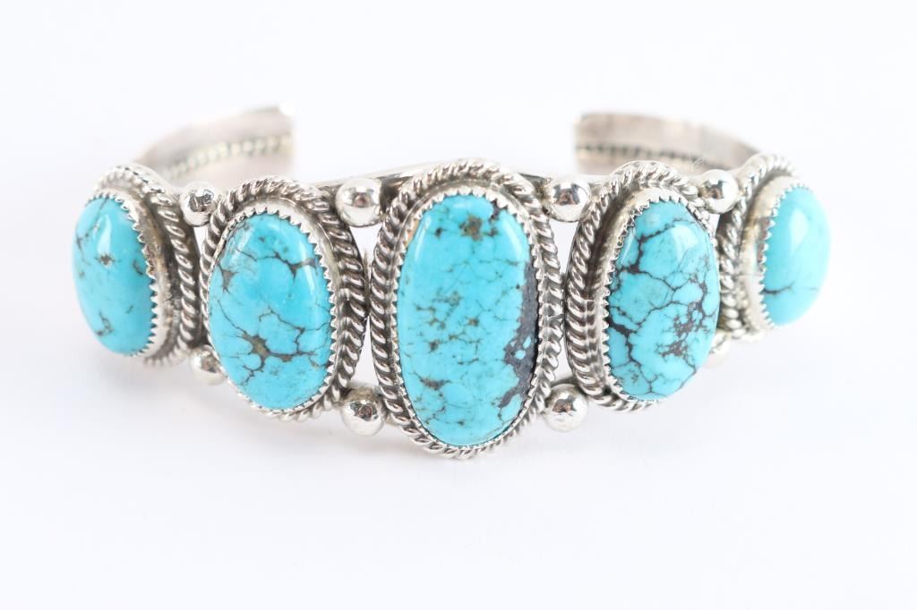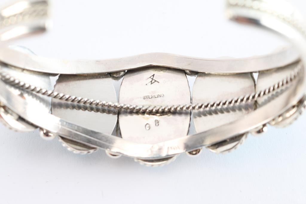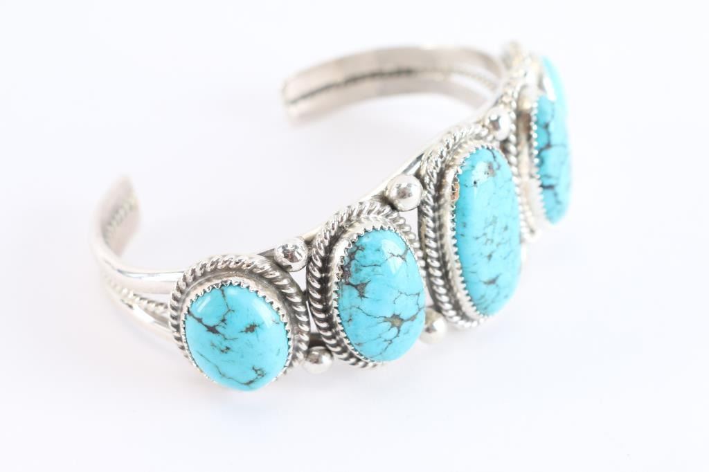 Set in sterling silver beautiful Ithaca Peak turquoise stones. Maker marked GB and sterling on back. Mined near Kingman, these free-form stones are bezel set and twist wire wrapped with drop accents on a premium weight of Sterling. The split band bracelet has a wire rope center. It's about 1" wide at the center and then tapers to the back. We stock and custom make this for wrist sizes 6" to 7-1/2". Diné smith Garrison Boyd, it's stamped Sterling and hallmarked. Classic Southwest style for ladies or gents.
