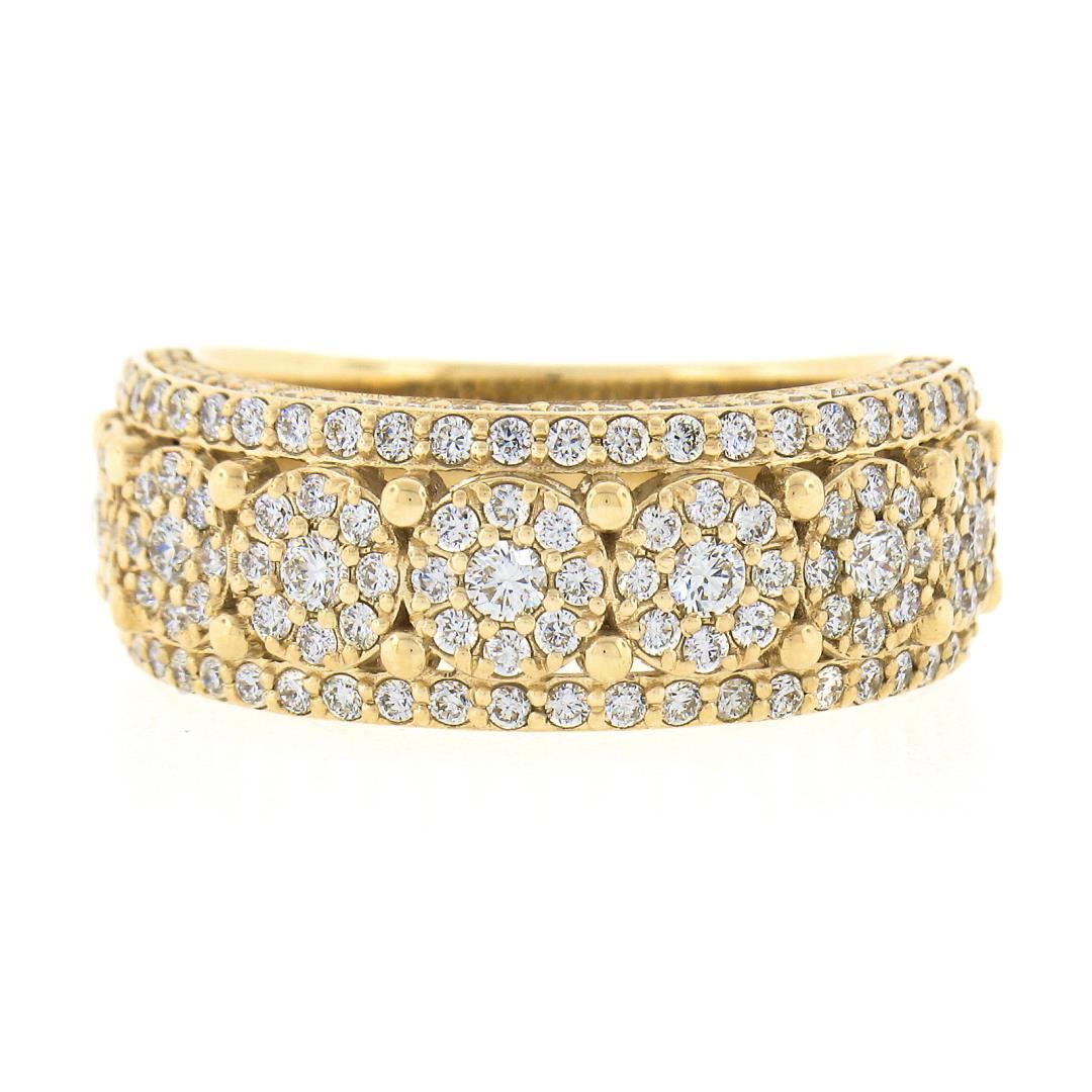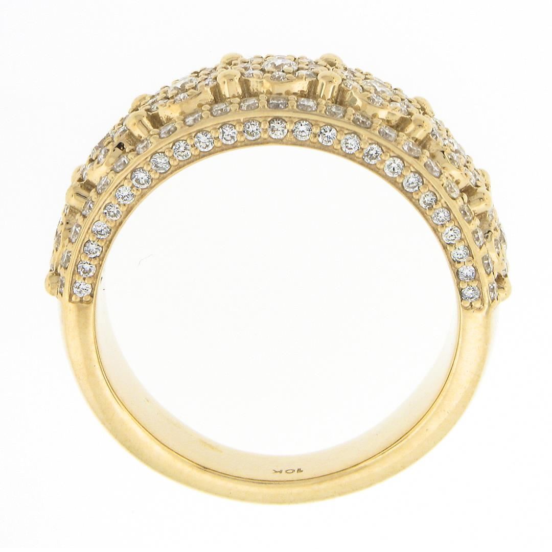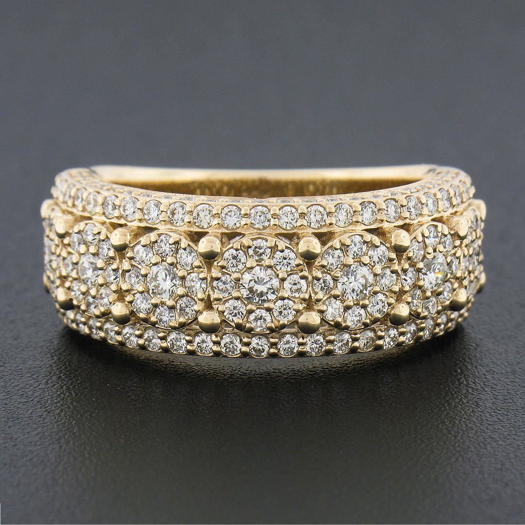 A solid 10k yellow gold cluster band ring, with 159 round brilliant cut natural diamonds (I/J - SI1/SI2 ; 2ctw). The ring is size 10.0, weighs a total of 8.34 grams, and measures 9mm wide.