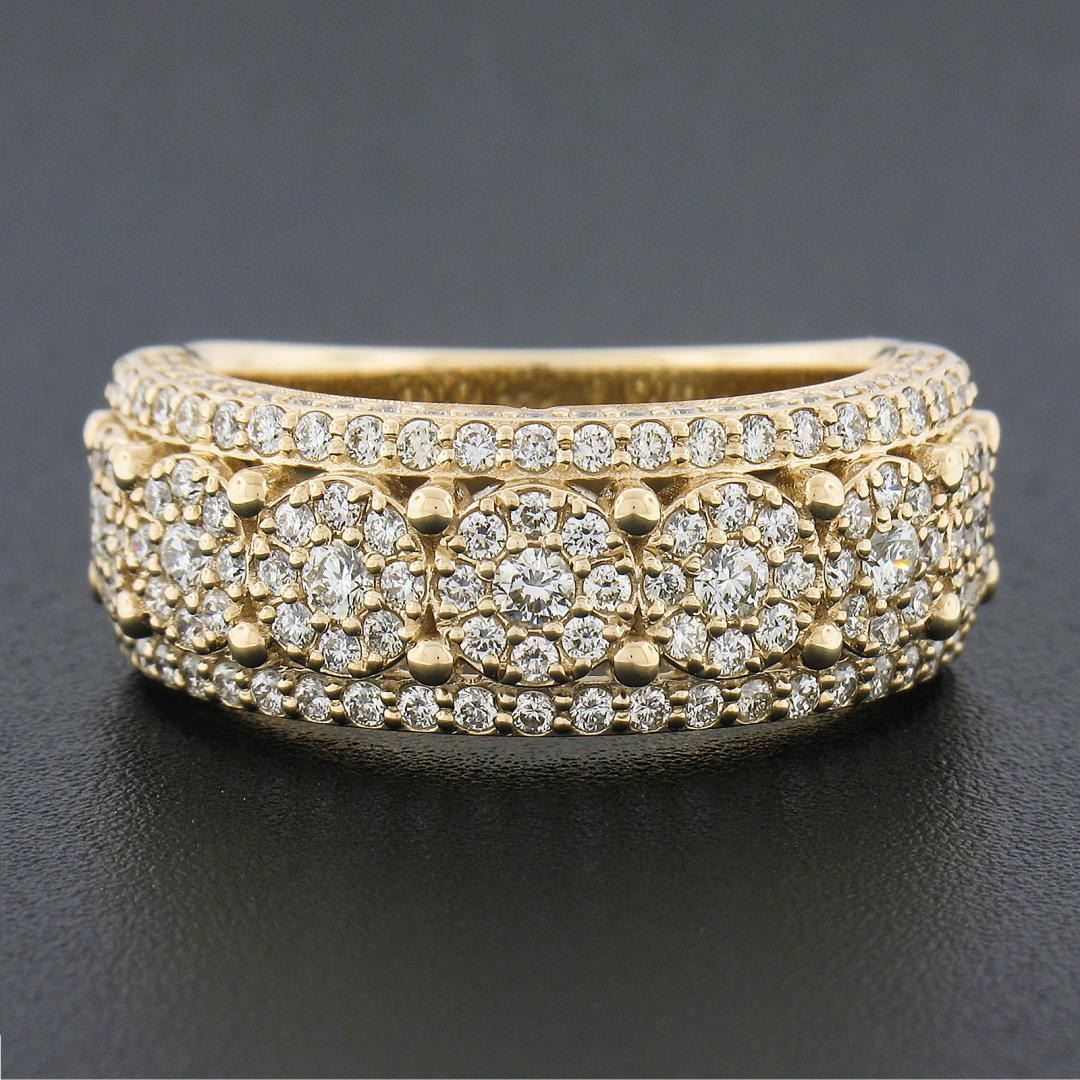 A solid 10k yellow gold cluster band ring, with 159 round brilliant cut natural diamonds (I/J - SI1/SI2 ; 2ctw). The ring is size 10.0, weighs a total of 8.34 grams, and measures 9mm wide.
