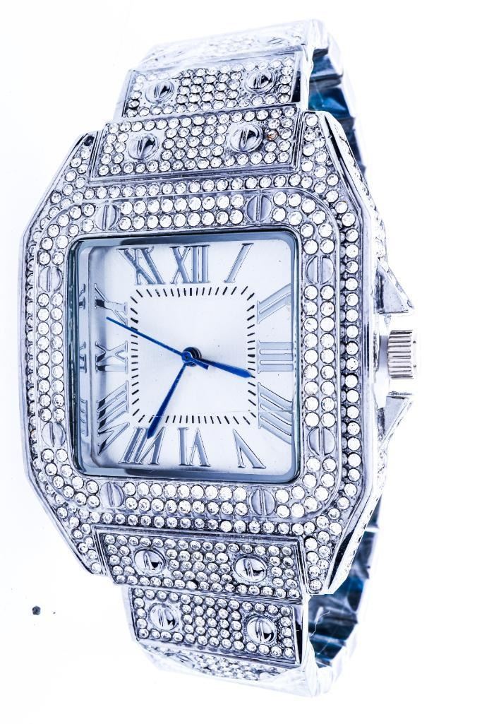Unisex Fancy Qtz. Watch, Micro Pave Set Swarovski Elements , Silver Dial, Roman Numerals, Stainless Steel Casing. ST