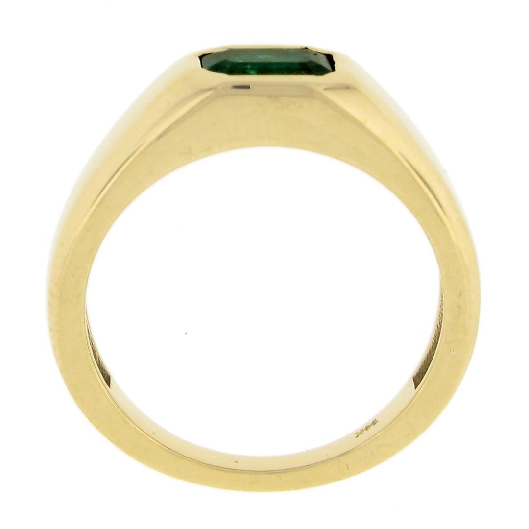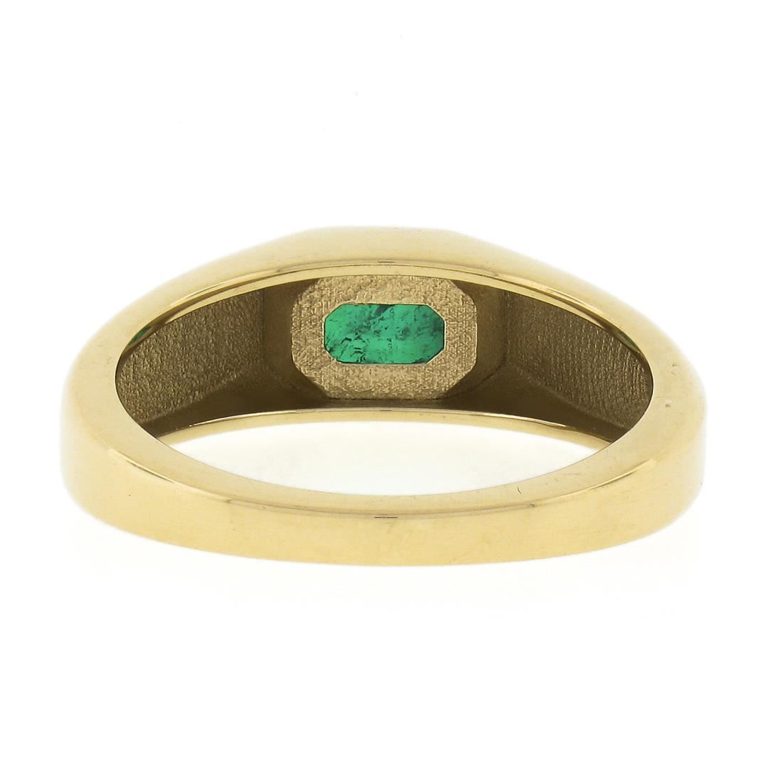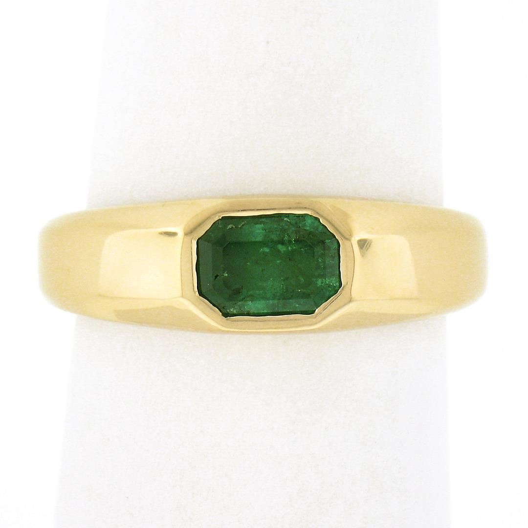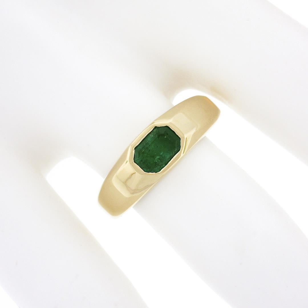 A new solid 14k yellow gold ring, with 1 sideways emerald cut natural emerald ( 0.66ct). The ring is size 6.5, weighs a total of 4.0 grams, and measures 6.3mm wide.