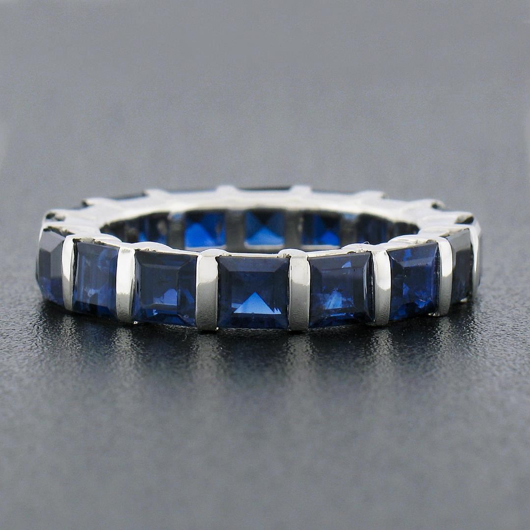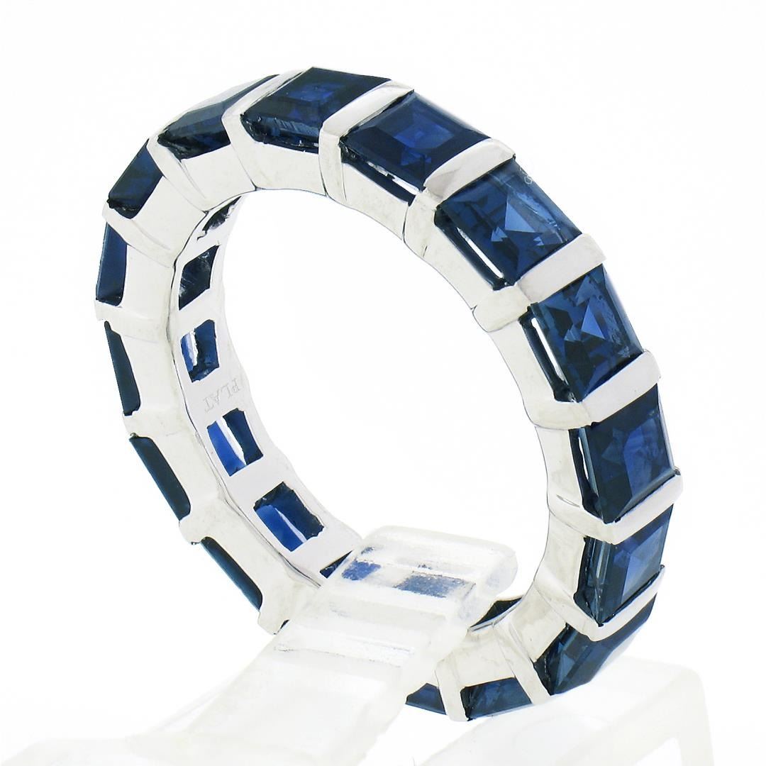 A solid platinum eternity band ring, featuring 16 square step cut natural sapphires (5.61ctw). The ring is size 7.0, weighs a total of 8.76 grams, and measures 4.20mm wide.