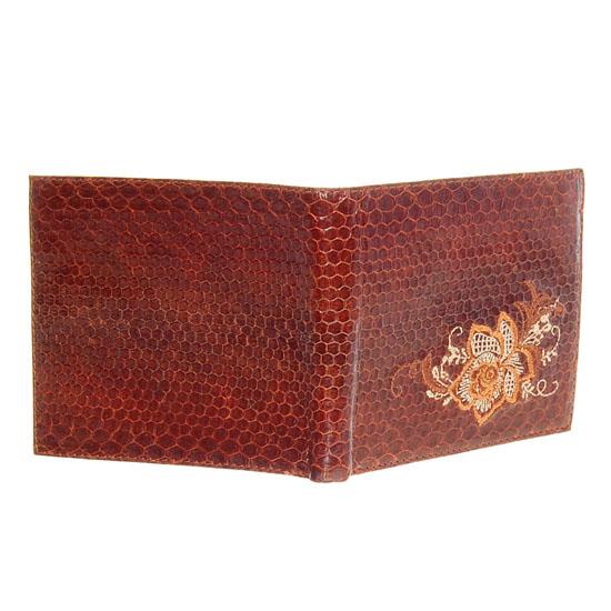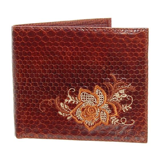Well made Sea Snake skin wallet with embroidered lotus. Brand new; 4.5" x 3.5" when folded. Multiple card slots and license flap inside. Inside of Sea Snake skin as well. $95 retail