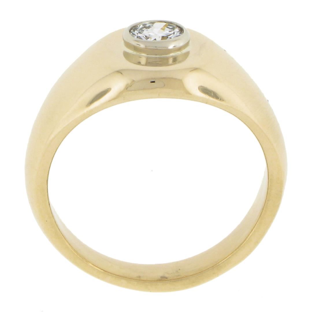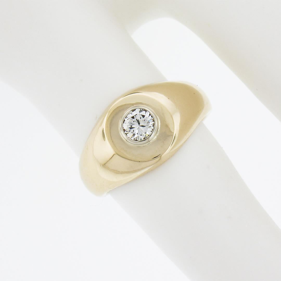 A solid 14k yellow gold signet band ring, with 1 round cut natural diamond (G - SI1 ; 0.21ct)The ring is size 3.75, weighs a total of 4.57 grams, and measures 9.3mm wide.