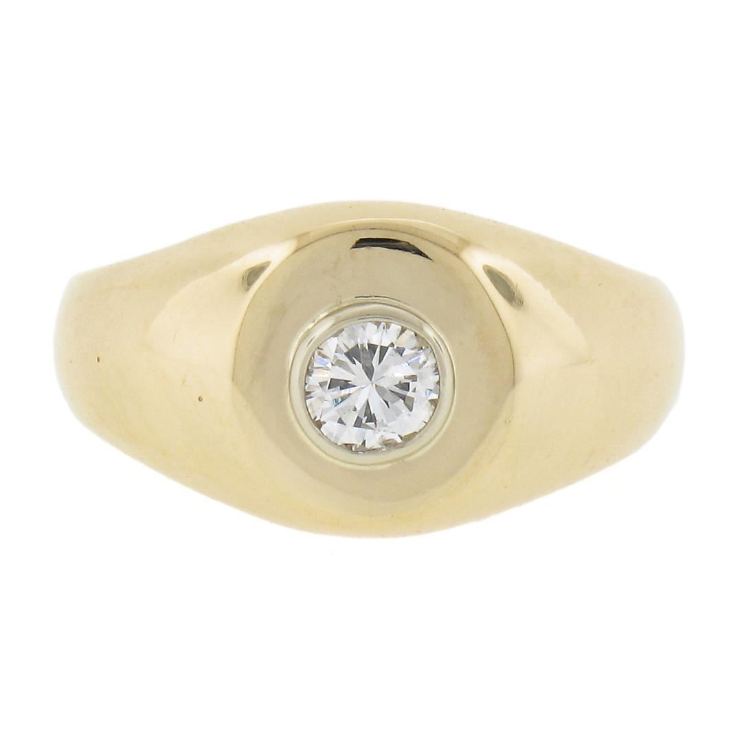 A solid 14k yellow gold signet band ring, with 1 round cut natural diamond (G - SI1 ; 0.21ct)The ring is size 3.75, weighs a total of 4.57 grams, and measures 9.3mm wide.