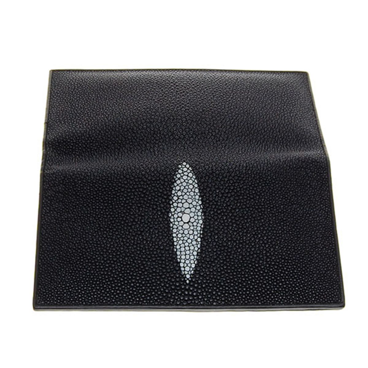 Well made, hand-dyed brand new Stingray Hide black checkbook/wallet. 7" x 4" x 3/4" when folded. Dual inside sections, with multiple dividers and a smaller zippered section inside and one with multiple bill and card dividers as well as a checkbook flap. - A truly unique accoutrement!