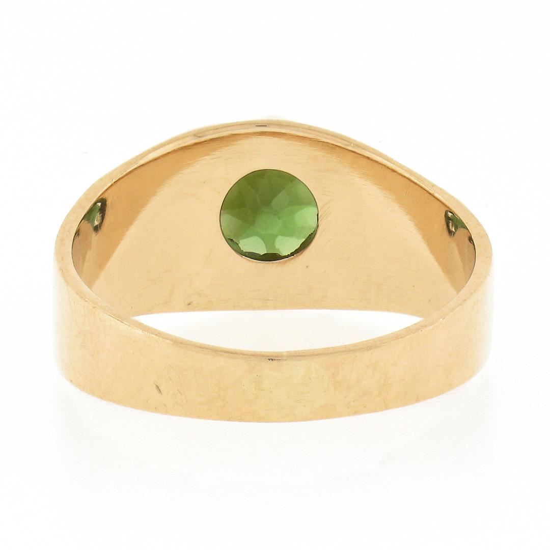 A vintage solid 14k yellow gold solitaire ring, with 1 round brilliant cut natural tourmaline (6.15mm / 0.85ct). The ring is size 5.5, weighs a total of 4.46 grams, and measures 8.7mm wide.