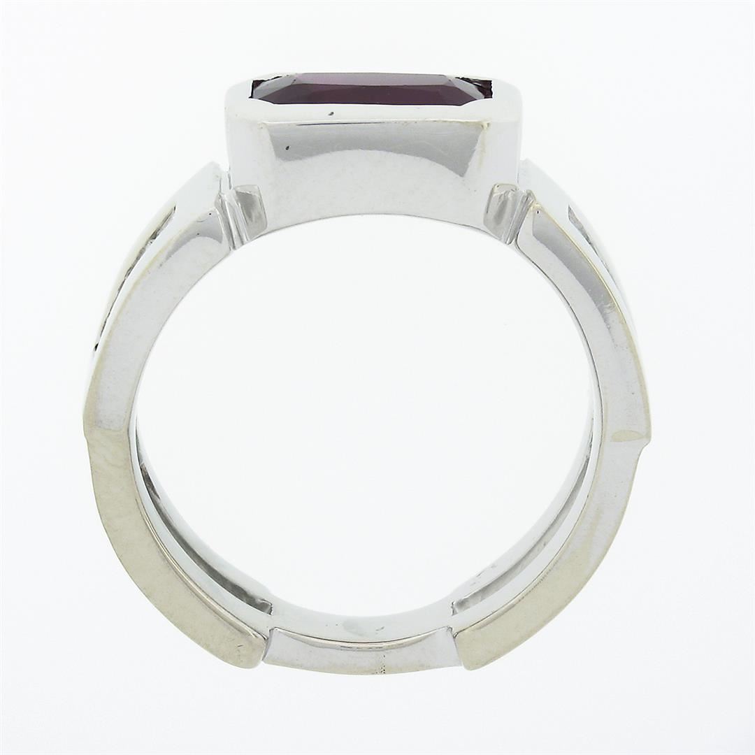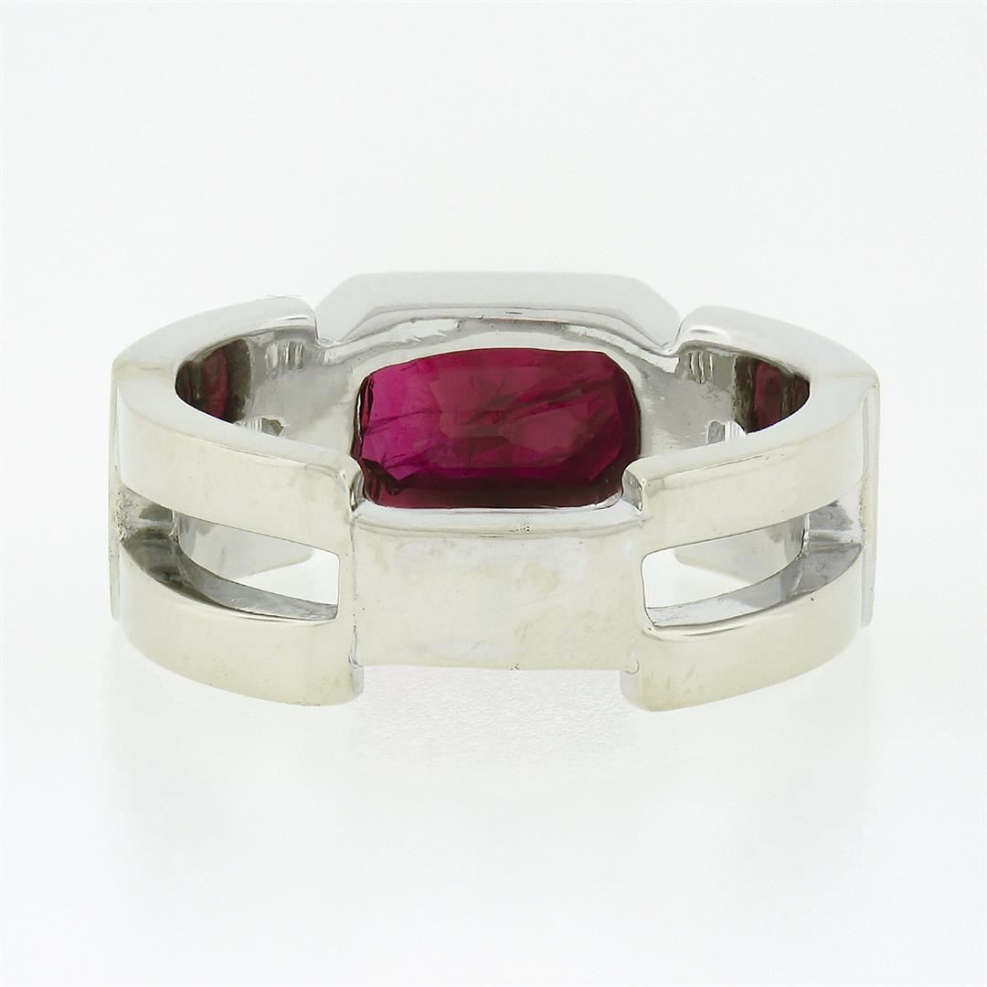 A vintage solid 14k white gold band ring, with 1 gia certified elongated octagonal step cut natural ruby (2.75ctw), and 8 baguette cut natural diamonds (G/H - VVS2/VS1 ; 0.80ctw). The ring is size 9.0, weighs a total of 12.56 grams, and measures 8.65mm wide. Comes with all original relevant certifications.