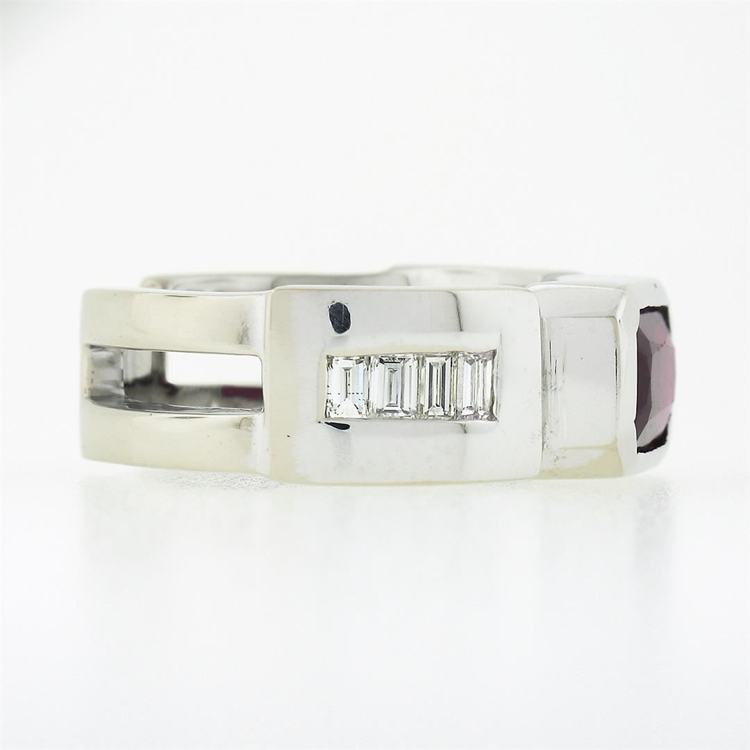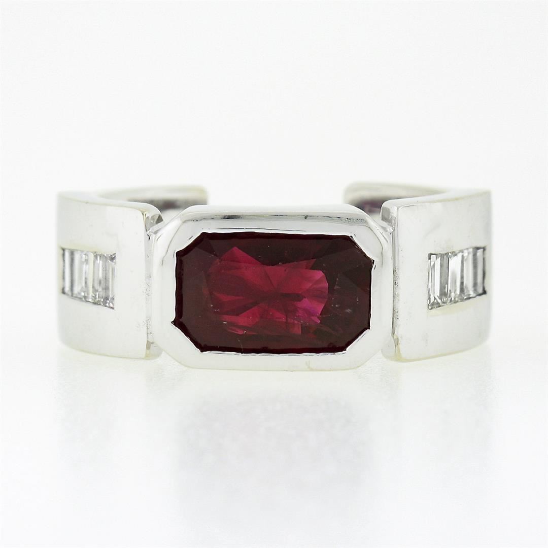 A vintage solid 14k white gold band ring, with 1 gia certified elongated octagonal step cut natural ruby (2.75ctw), and 8 baguette cut natural diamonds (G/H - VVS2/VS1 ; 0.80ctw). The ring is size 9.0, weighs a total of 12.56 grams, and measures 8.65mm wide. Comes with all original relevant certifications.