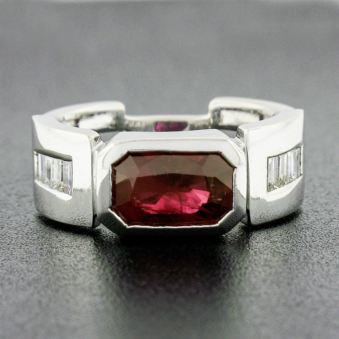 A vintage solid 14k white gold band ring, with 1 gia certified elongated octagonal step cut natural ruby (2.75ctw), and 8 baguette cut natural diamonds (G/H - VVS2/VS1 ; 0.80ctw). The ring is size 9.0, weighs a total of 12.56 grams, and measures 8.65mm wide. Comes with all original relevant certifications.
