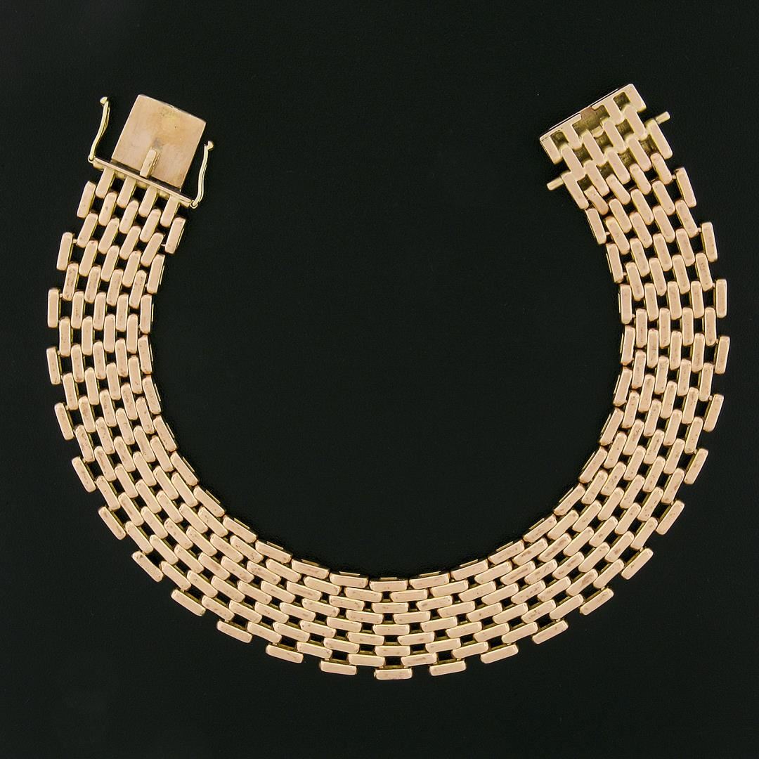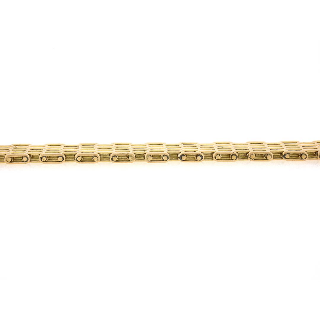 A vintage solid 14k yellow gold brick bracelet. It weighs a total of 40.12 grams, measures 14.80mm wide, and measures 7.75 inches in length.