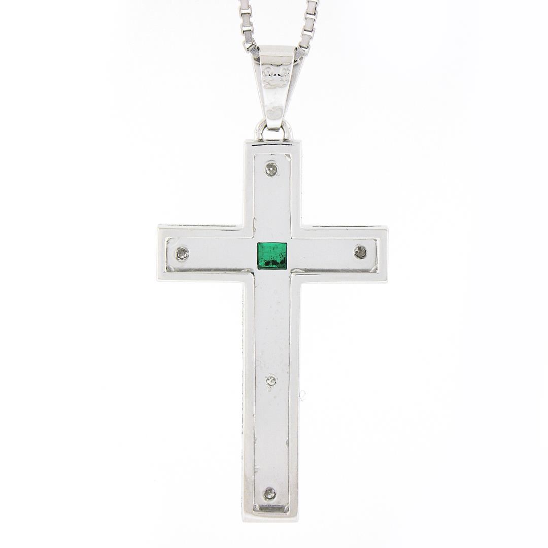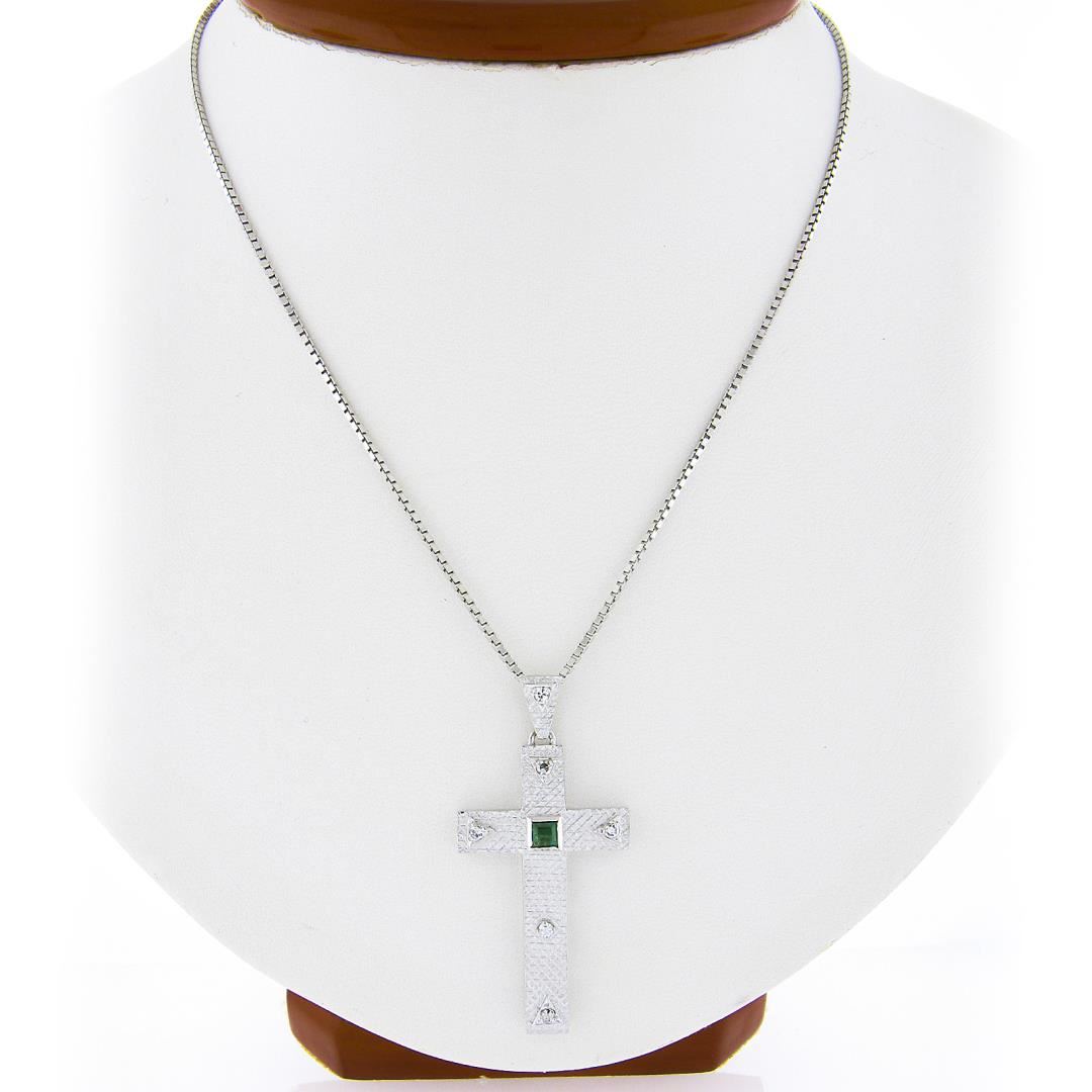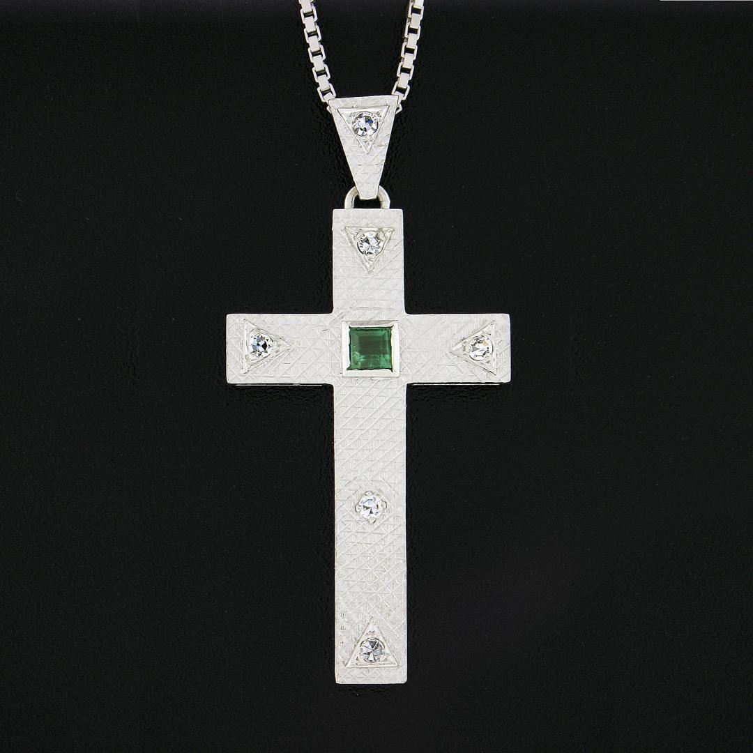 A vintage solid 18k white gold cross pendant necklace, with 1 square cut natural emerald (0.25ct), and 6 old single cut natural diamonds (H/I - SI1/SI2 ; 0.25ctw). 24 inch box link chain, 13.58 grams total weight, pendant measures 44.9x21.8mm.