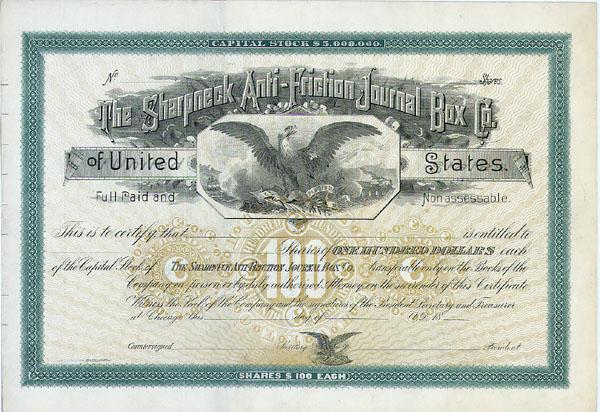 No date. Stock certifiacte for 0 shares. Green/White. Vignette of a spread eagle at top center. Unissued, uncancelled and very fine.