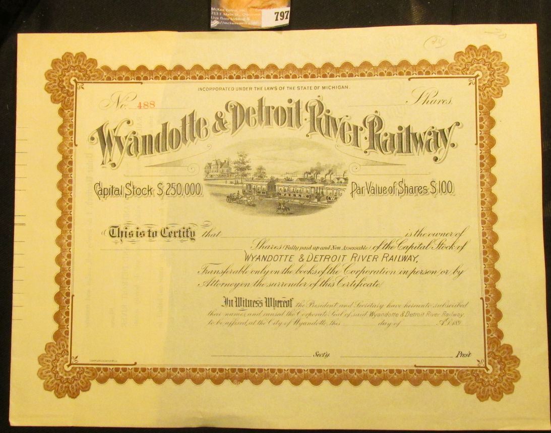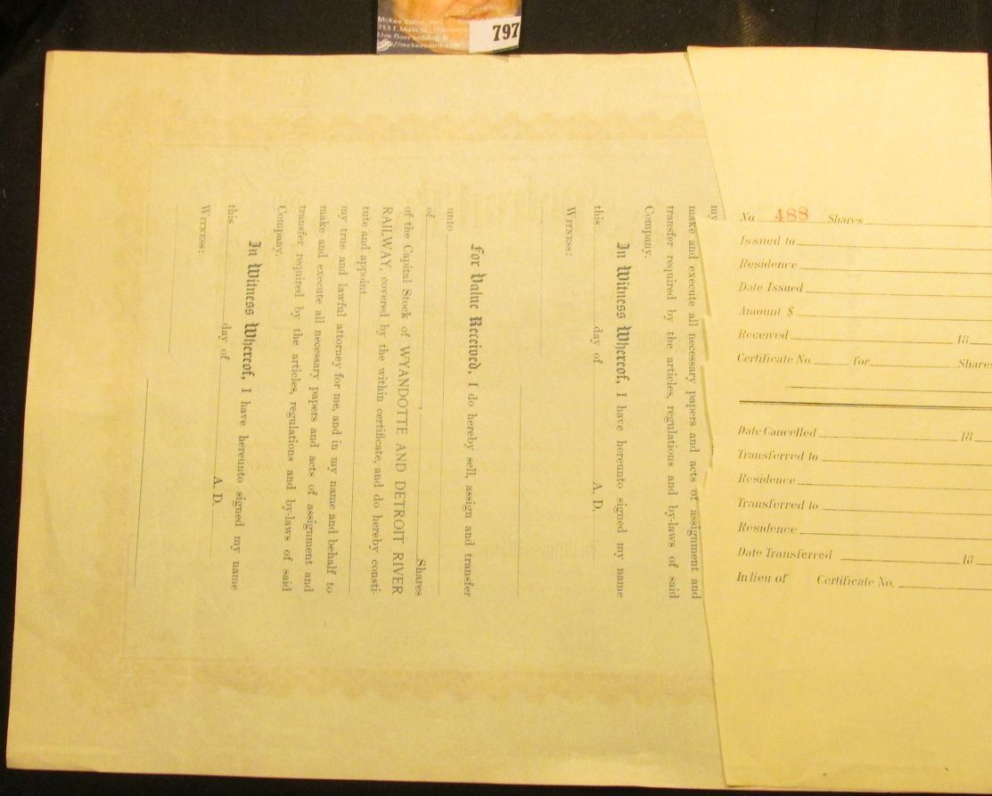 Unissued State of Michigan Stock Certificate "Wyandotte & Detroit River Railway", 1890 era.