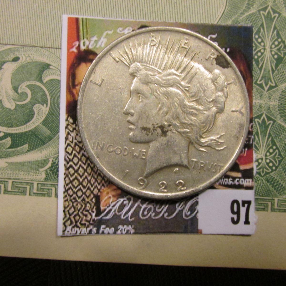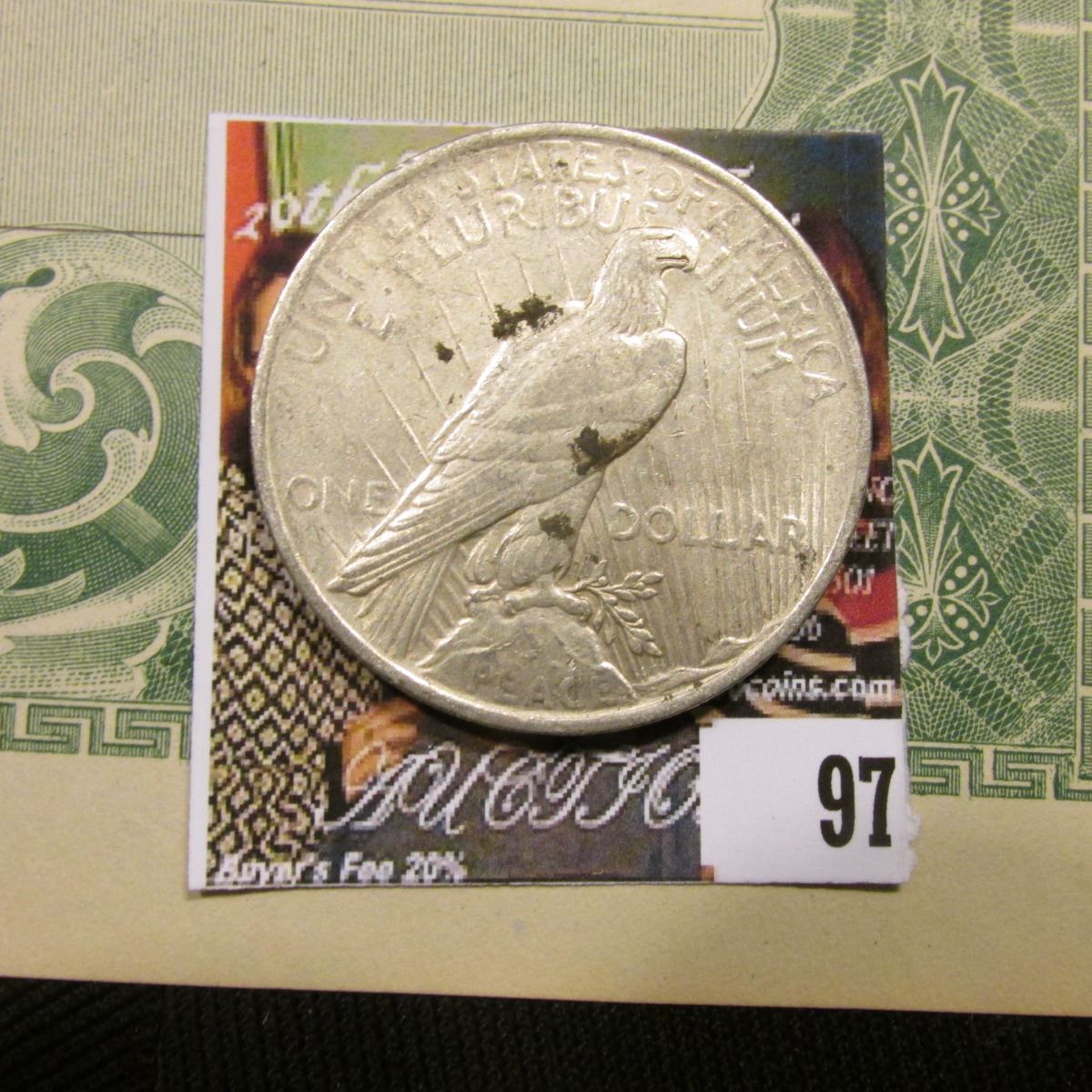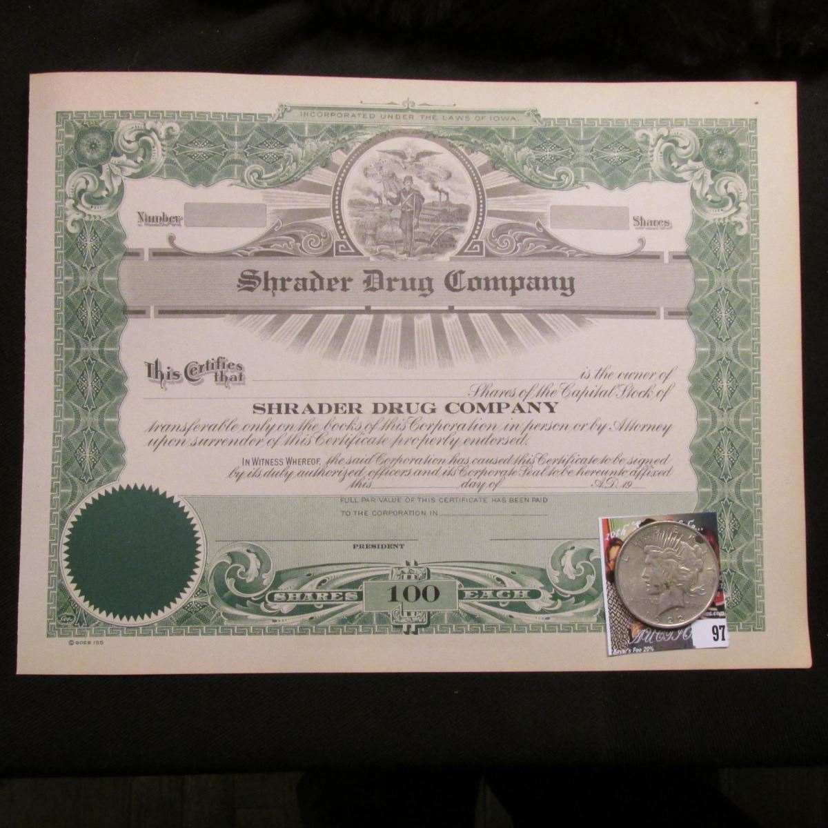 Unissued early 1900 Stock Certificate "Shrader Drug Company…Incorporated Under the Laws of Iowa", central vignette of Seal of State of Iowa; & 1922 P U.S. Peace Silver Dollar, VF.