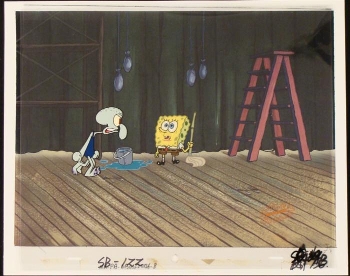This animation cel and reproduction background are from the Nickelodeon TV show SpongeBob Squarepants. The story takes place under the deep blue sea in Bikini Bottom, where SpongeBob resides. SpongeBob, who is a yellow, porous sponge, is your typical happy-go-lucky character, as he is always cheerful and enjoys making people laugh. Patrick Star, SpongeBob's neighbor who is a starfish, is your average children's show idiot, as he boasts knowing nothing and is often getting himself into ridiculous situations. Between the homes of these two lies the home of the miserable Squidward, a squid, who is known for being grouchy and playing tricks on SpongeBob and Patrick. Both SpongeBob and Squidward work at the Krusty Krab, a fast food business run by the greedy money-loving Mr. Krabs, a crab, the arch rival of the evil, possibly misunderstood, Plankton. Another neighbor, Sandy Cheeks, an athletic squirrel who normally wears an astronaut's space suit, was introduced in "Tea at the Treedome." She spends most of her time inventing and experimenting. Why is Squidward in a unitard.Original Printed Background and Animated Cel Overall Size of Background: 11" x 13 1/2" Overall Size of the Cel: 10 1/2" x 12 1/2" Very good condition This is an original hand-painted cel set-up used in the production of an episode of "SpongeBob SquarePants." Each one-of-a-kind set-up represents a slight change in position of the characters. When individually photographed and projected in rapid succession, the images appear to move.