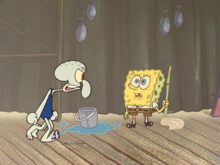 This animation cel and reproduction background are from the Nickelodeon TV show SpongeBob Squarepants. The story takes place under the deep blue sea in Bikini Bottom, where SpongeBob resides. SpongeBob, who is a yellow, porous sponge, is your typical happy-go-lucky character, as he is always cheerful and enjoys making people laugh. Patrick Star, SpongeBob's neighbor who is a starfish, is your average children's show idiot, as he boasts knowing nothing and is often getting himself into ridiculous situations. Between the homes of these two lies the home of the miserable Squidward, a squid, who is known for being grouchy and playing tricks on SpongeBob and Patrick. Both SpongeBob and Squidward work at the Krusty Krab, a fast food business run by the greedy money-loving Mr. Krabs, a crab, the arch rival of the evil, possibly misunderstood, Plankton. Another neighbor, Sandy Cheeks, an athletic squirrel who normally wears an astronaut's space suit, was introduced in "Tea at the Treedome." She spends most of her time inventing and experimenting. Why is Squidward in a unitard.Original Printed Background and Animated Cel Overall Size of Background: 11" x 13 1/2" Overall Size of the Cel: 10 1/2" x 12 1/2" Very good condition This is an original hand-painted cel set-up used in the production of an episode of "SpongeBob SquarePants." Each one-of-a-kind set-up represents a slight change in position of the characters. When individually photographed and projected in rapid succession, the images appear to move.