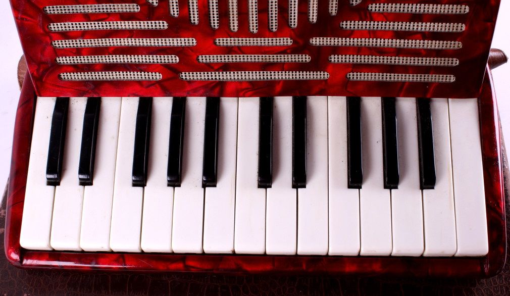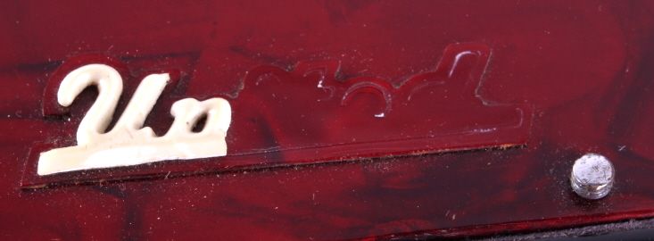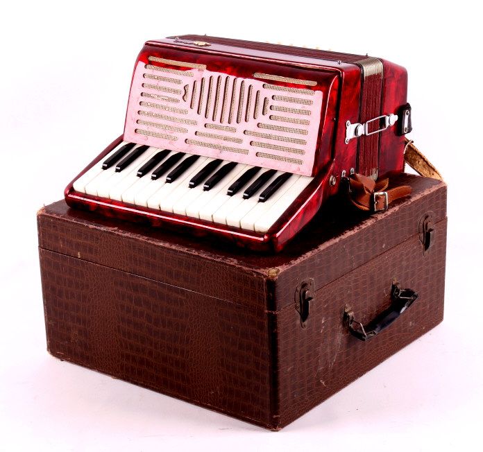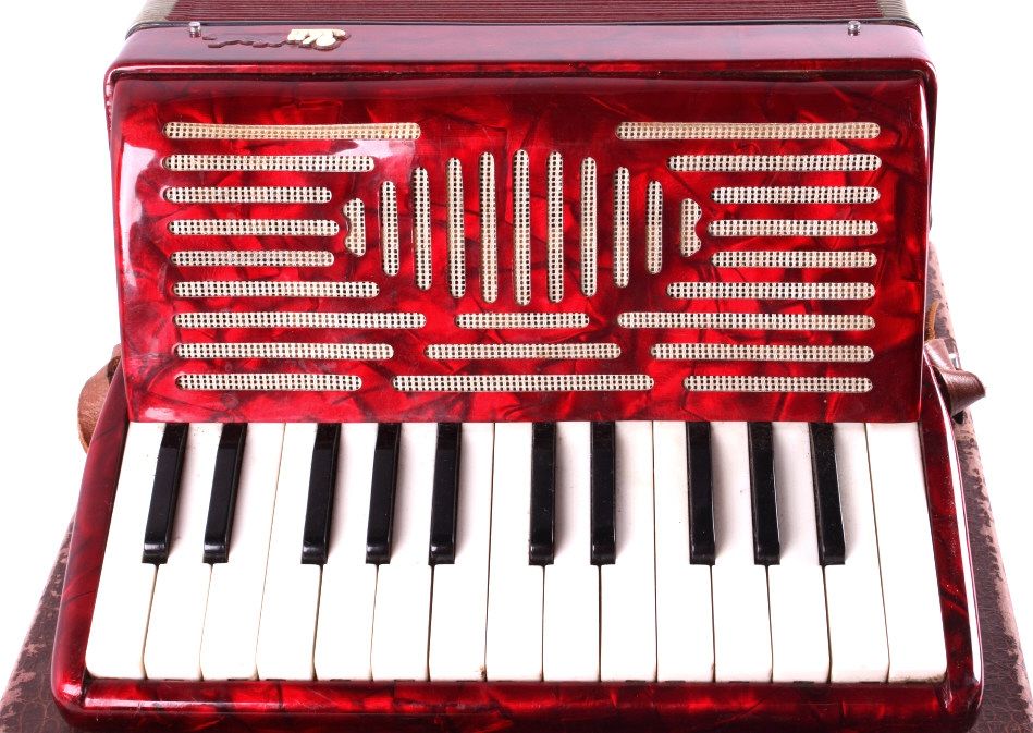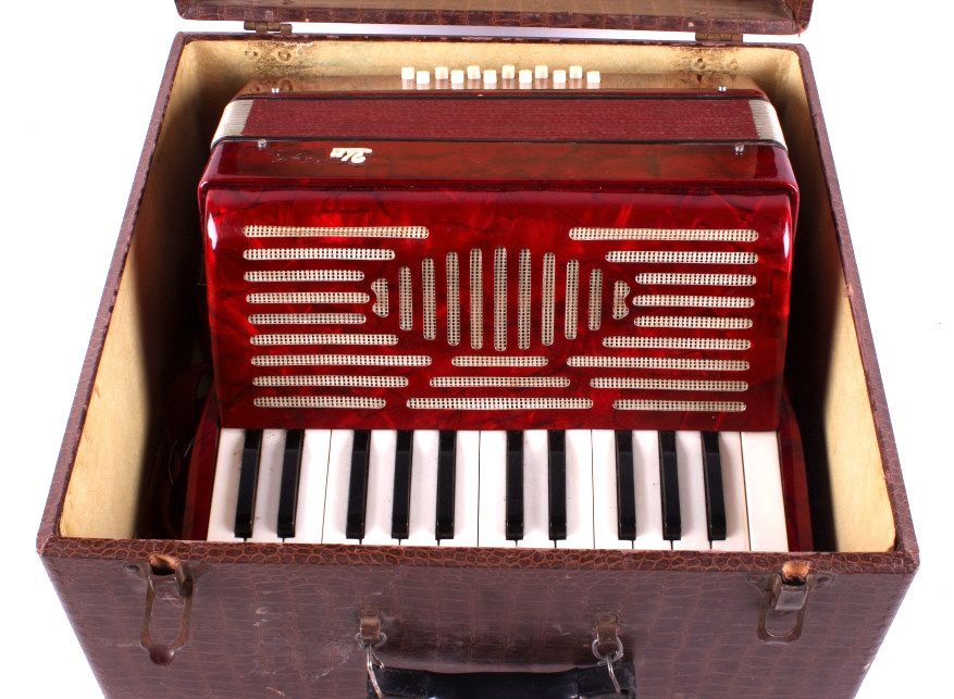 This is a United accordion with case. The keyboard has 15 keys and there are 12 bass buttons. The bellows are intact with no visible damage or leaks. The accordion is in very good condition. It measures 12" x 13" x 6.5"