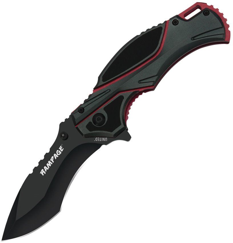 Rampage Evolution A/O - 4 1/2" closed linerlock. 3 1/4" black coated, recurve, assisted opening, AUS-6 stainless spear point blade with thumb stud, thumb ridge and extended tang. Red anodized stainless liners. Gun metal gray aluminum handles with black ABS textured inserts. Lanyard slot. Black stainless pocket clip with slot cutout design.