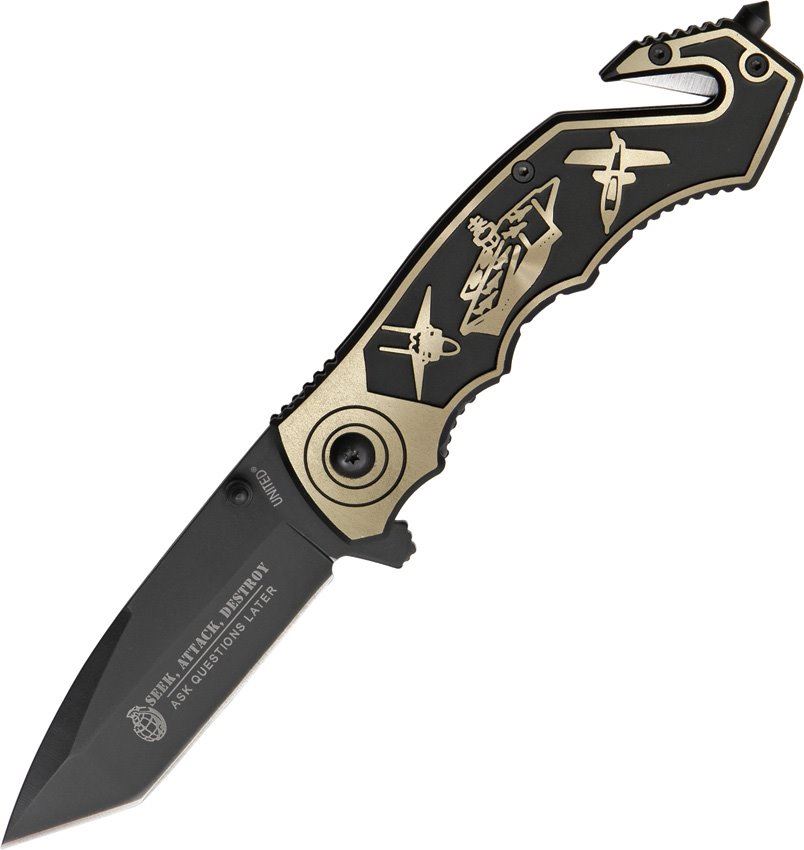 Seek Attack Destroy A/O Folder - 4 3/4" closed framelock. 3 3/8" AUS-6 stainless black coated tanto blade etched "Seek, Attack, Destroy. Ask Questions Later." Thumb stud. Black aluminum handles with integrated seat belt cutter and glass breaker. Brown anodized cutout plane/ship design on handle. Black stainless pocket clip. Powered by multiple Blackie Collins patents. NEW