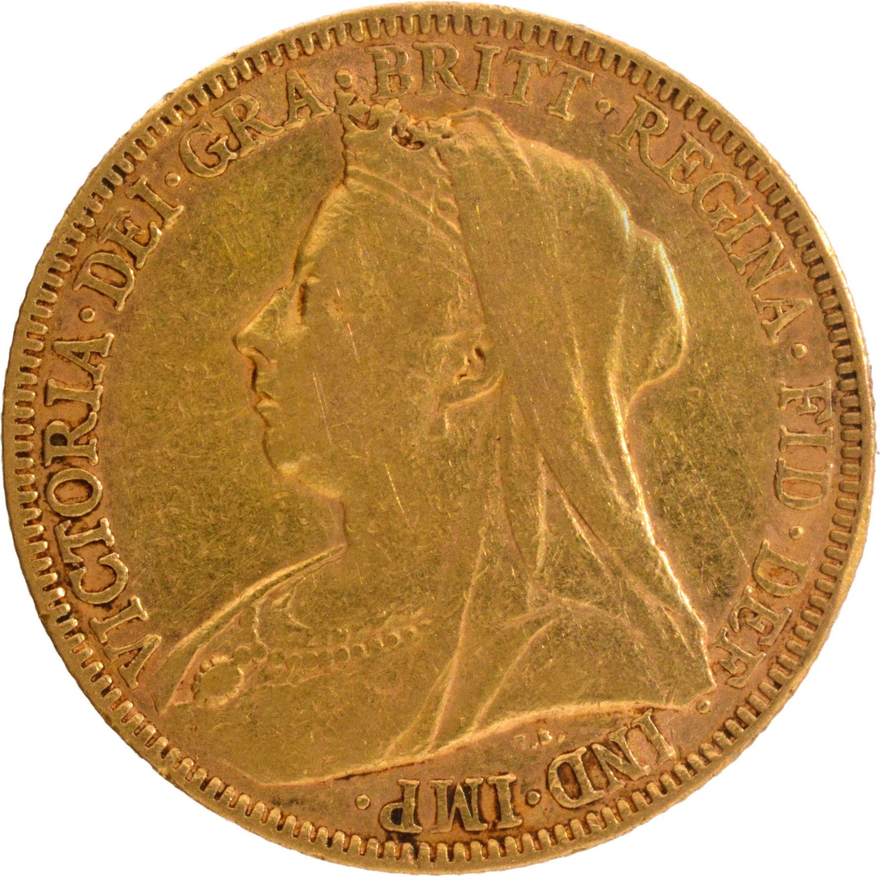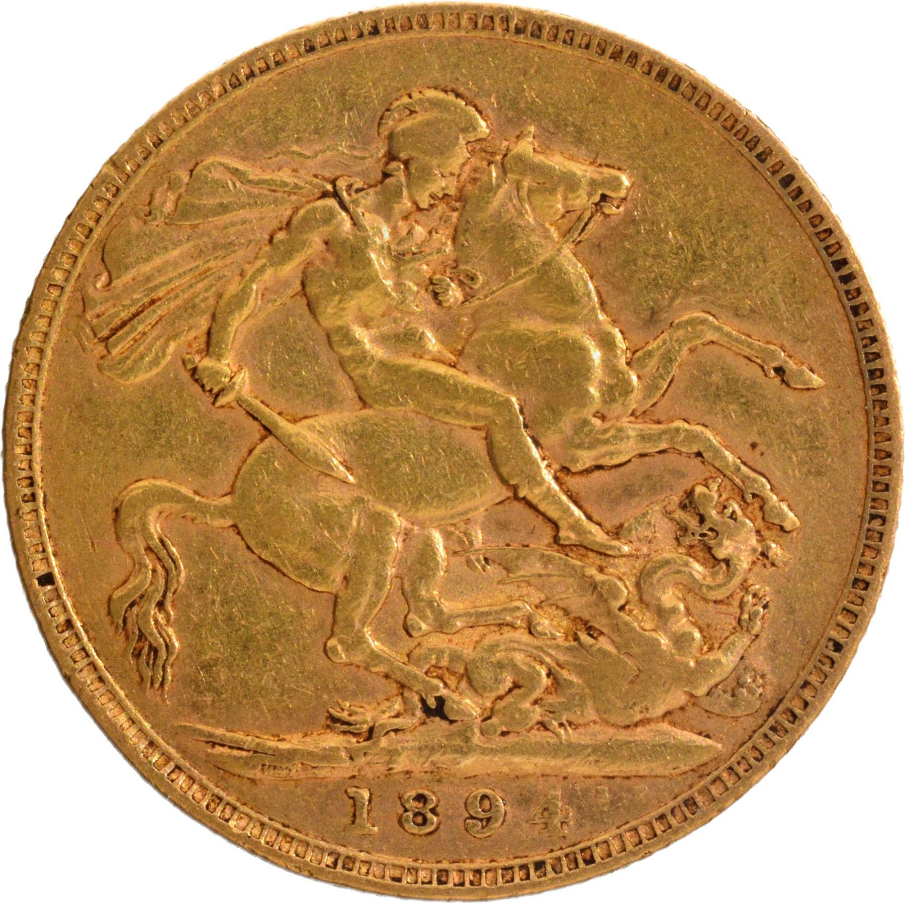 United Kingdom, Victoria Queen,Gold Sovereign,1894,Obv:veiled bust of the queen facing to left,legend around the field,Rev:St. George slaying the dragon, helmet streamer flow from lance to the rim,date 1894in the exergue,7.8g, 21.92mm,(KM # 785),choice veryfine,Rare.