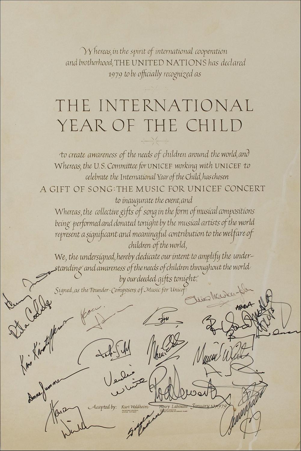 Poster, 16 x 24, of the 1979 United Nations proclamation announcing the International Year of the Child, signed in black felt tip by 19 UNICEF composers including, Andy, Barry, Maurice, and Robin Gibb, all four members of ABBA, John Denver, Olivia Newton-John, Donna Summer, Kris Kristofferson, Rita Coolidge, Henry Fonda, Henry Winkler, Gilda Radner, and two members of Earth, Wind, and Fire. Poster is affixed to an identical size piece of foam core. In very good condition, with scattered toning and soiling, a few surface dings and creases, and several white streaks. An impressive collection of all, the performers at the January 9, 1979, concert, as well as a chance to have all four Gibbs on a single item.
