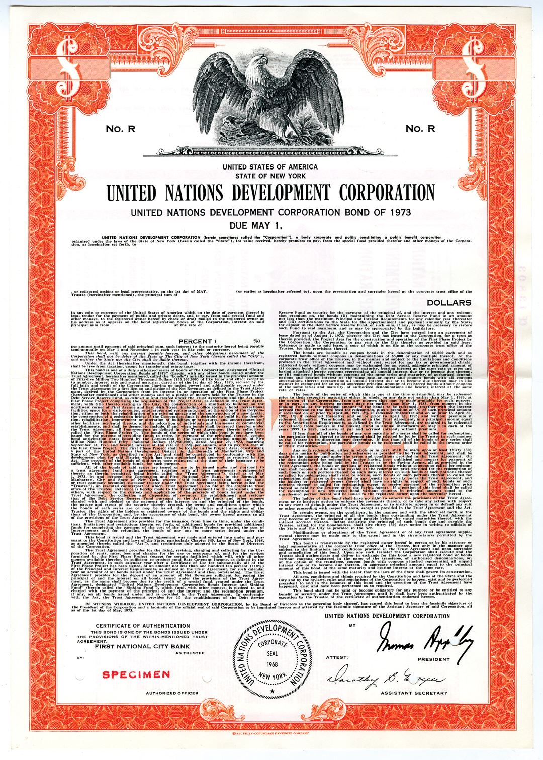 New York, 1973. $-Odd Specimen %Odd Registered Bond, Black text with orange border and underprint, Eagle at top center. Red specimen overprint and POCs. VF condition, SCBN. The United Nations Development Corporation (UNDC) is a New York State public-benefit corporation in the U.S. state of New York that helps the United Nations with its real estate, office space, and development needs. It was created in 1968.