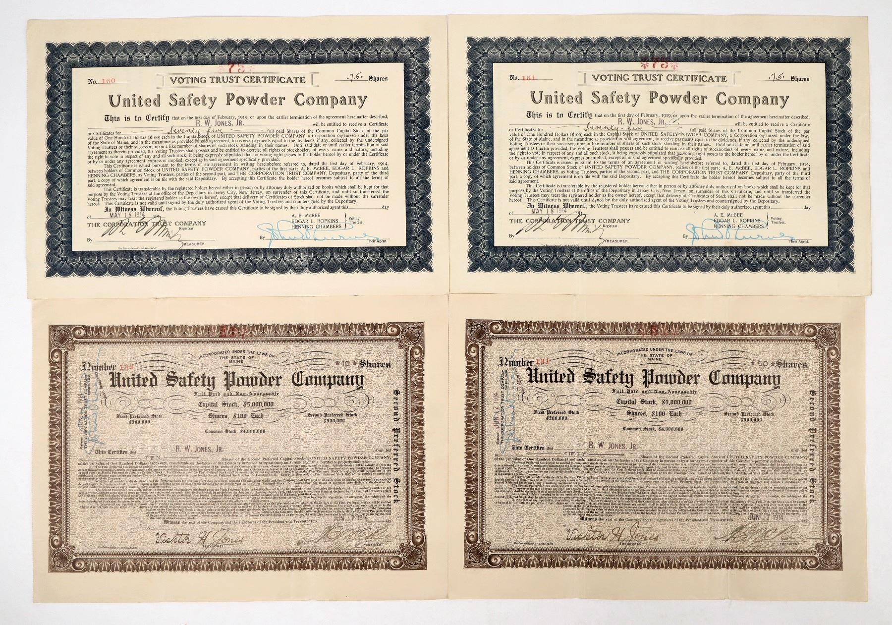 Lot of 4. 1914 issued, I/U. United Safety Powder Co. Stock. Brown-Greene Co. printer. Fine cond.