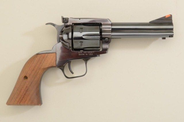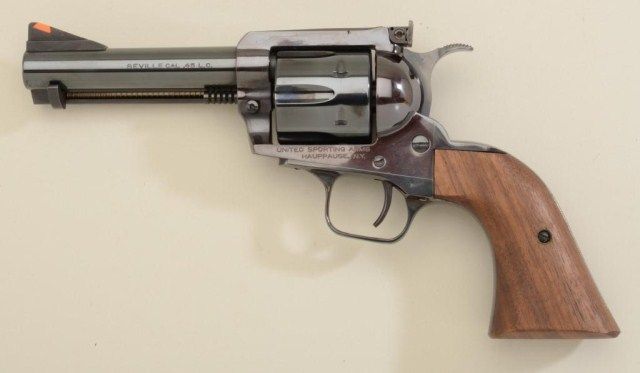 United Sporting Arms “Seville” single action revolver, .45LC cal., #45-1202T; made in USA; 4-5/8” barrel, blue finish, wood grips, similar in style to Ruger but nicely finished with smooth action; 97-99% finish; slightlyused but well cared for. Est.: $300-$600.