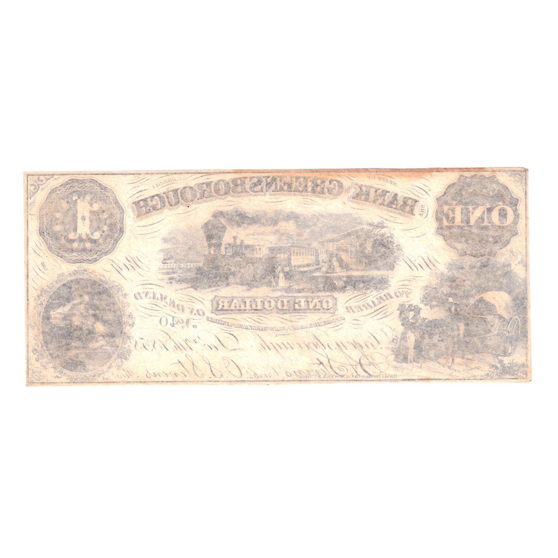 United State 1858 Bank of Greensborough $1, S/N: 40-A. Note is an attractive Mint state example.