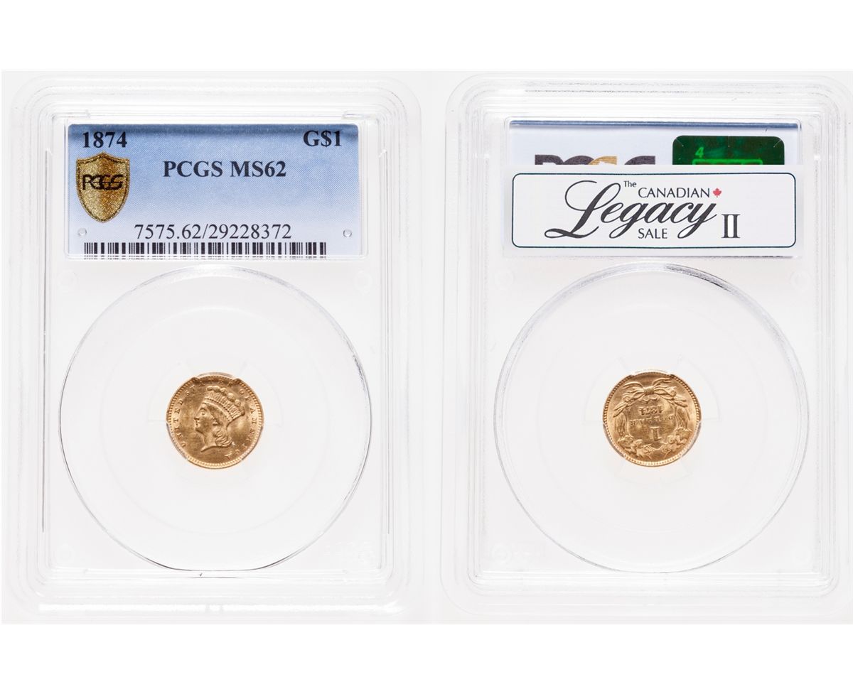 $1 Gold. 1874. 1.672g, .900, 0.04837oz AGW. PCGS graded Uncirculated-62.