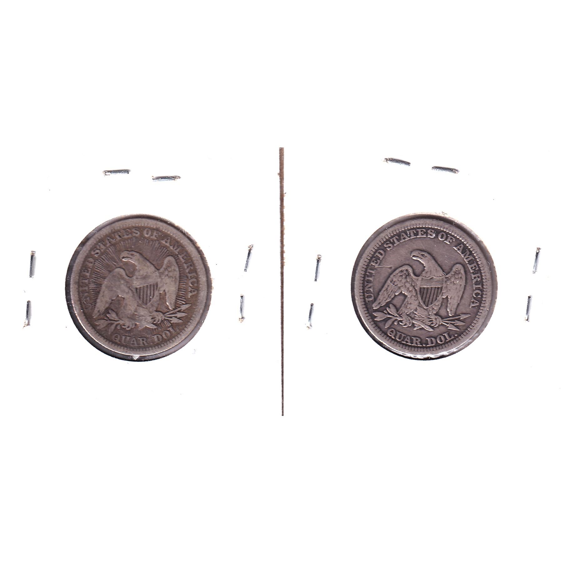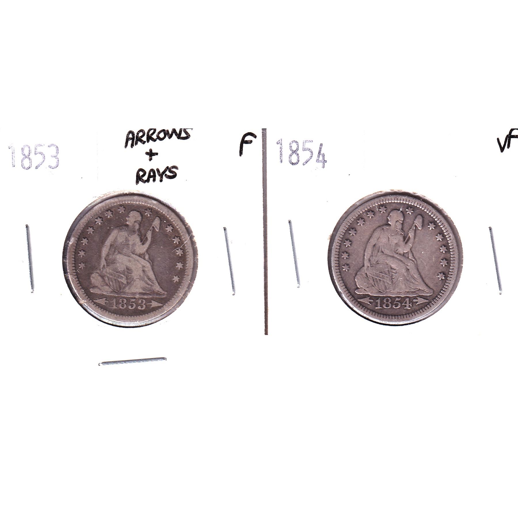 United States 1853 25-cent Arrows + Rays in Fine & 1854 in VF Seated Liberty 25-cent.