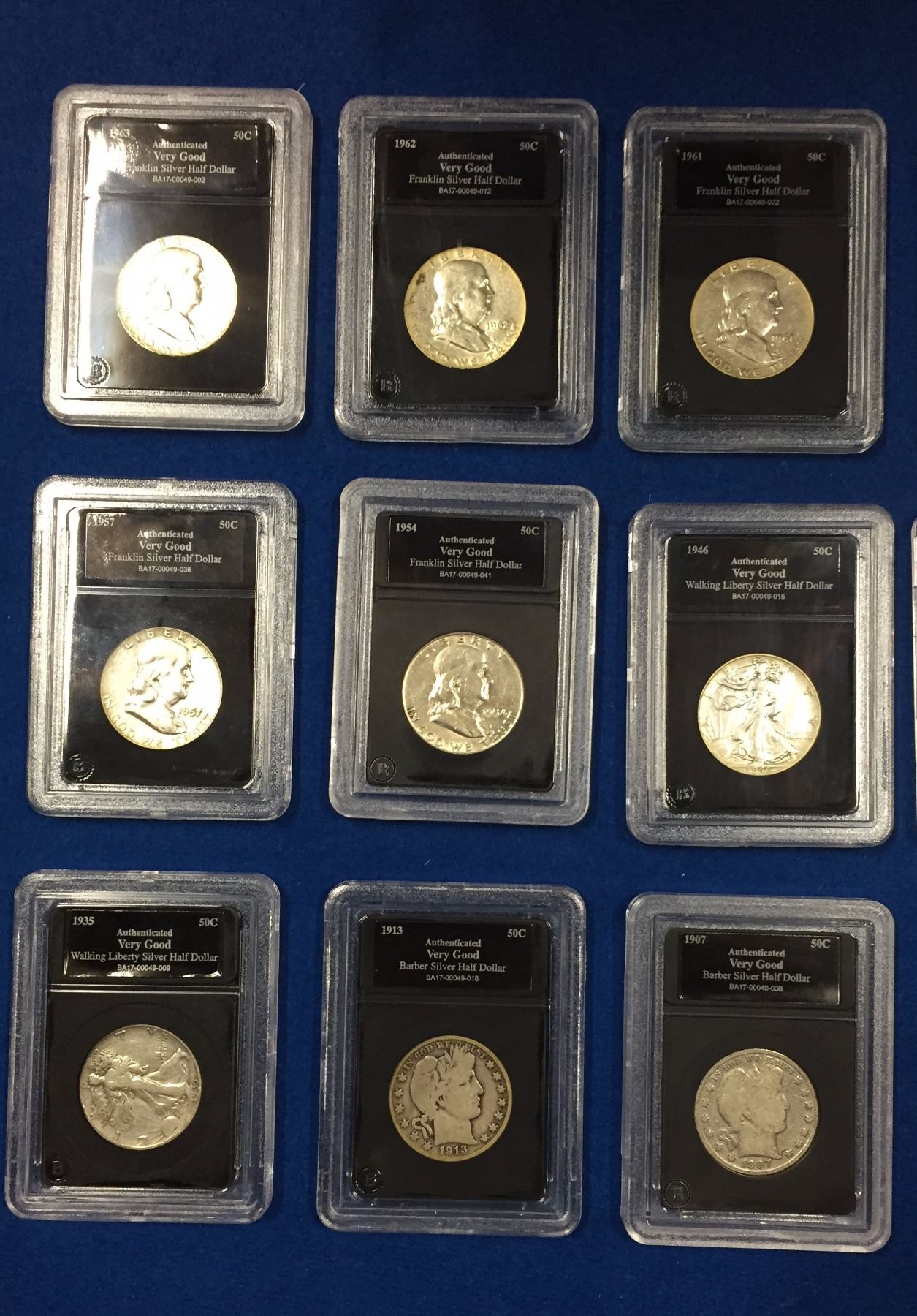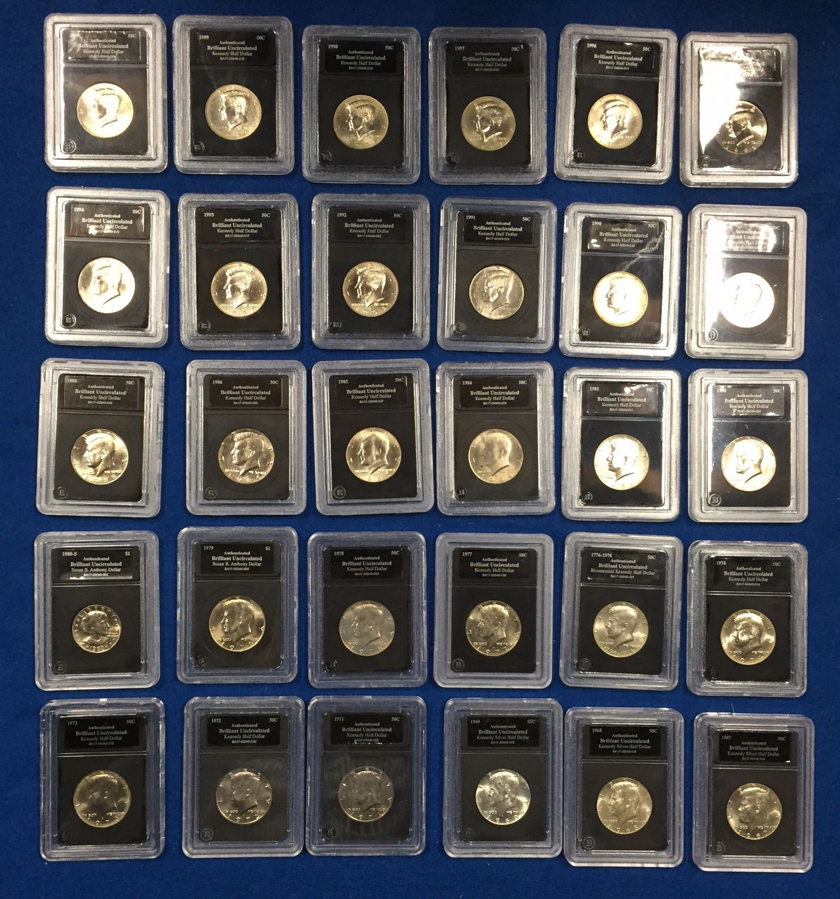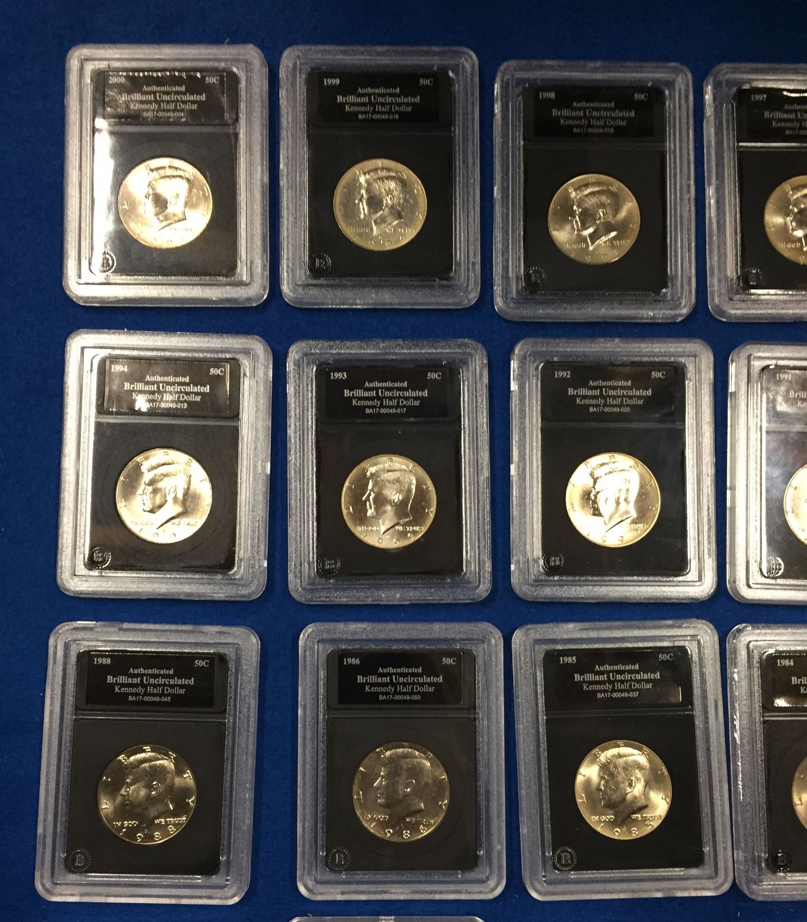 United States 1907 to 2000, 50 Cent Collection. Includes 46 coins. 19 are silver. All coins sealed in capsules. Coin collection is presented in a wooden display case.