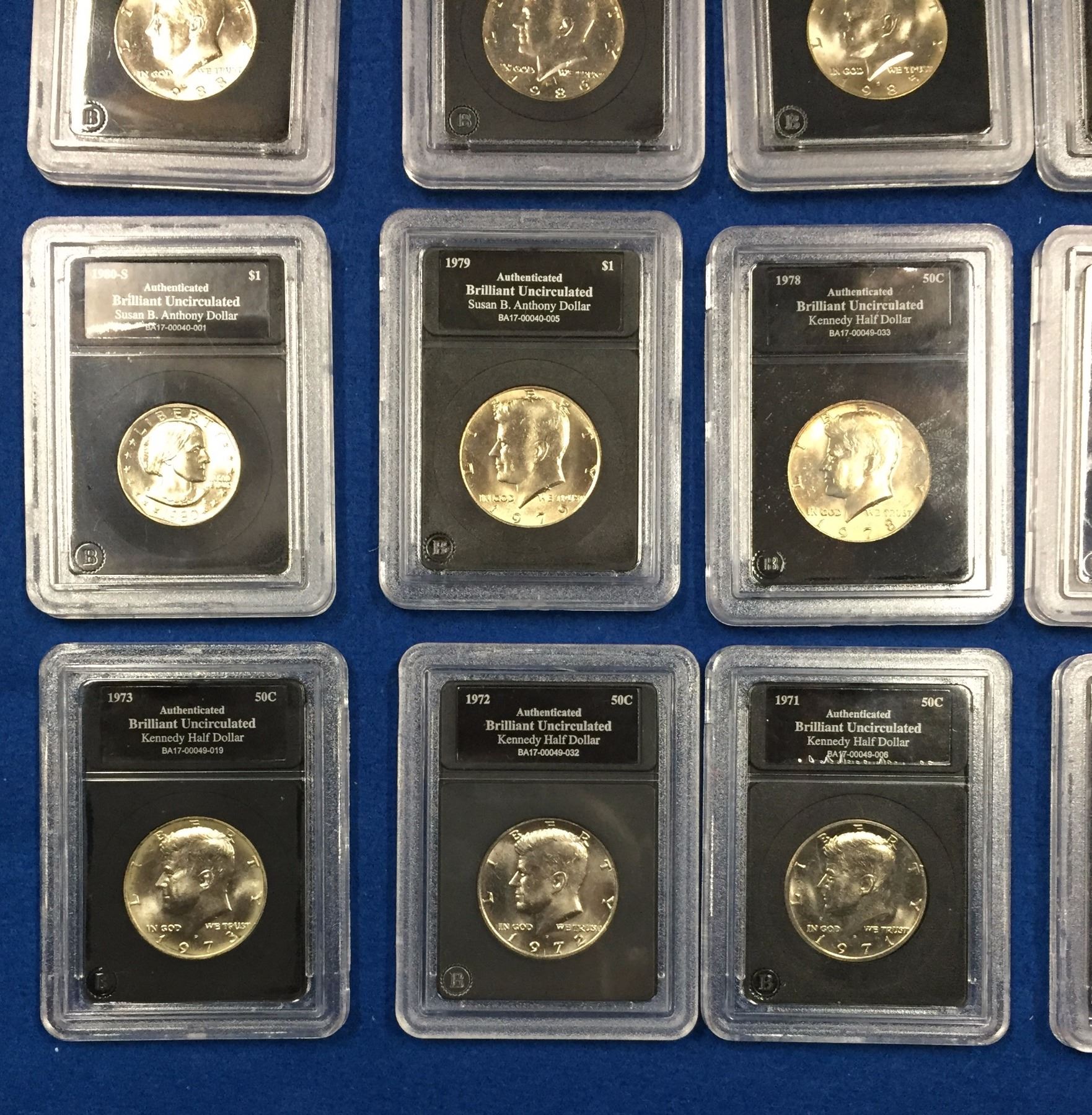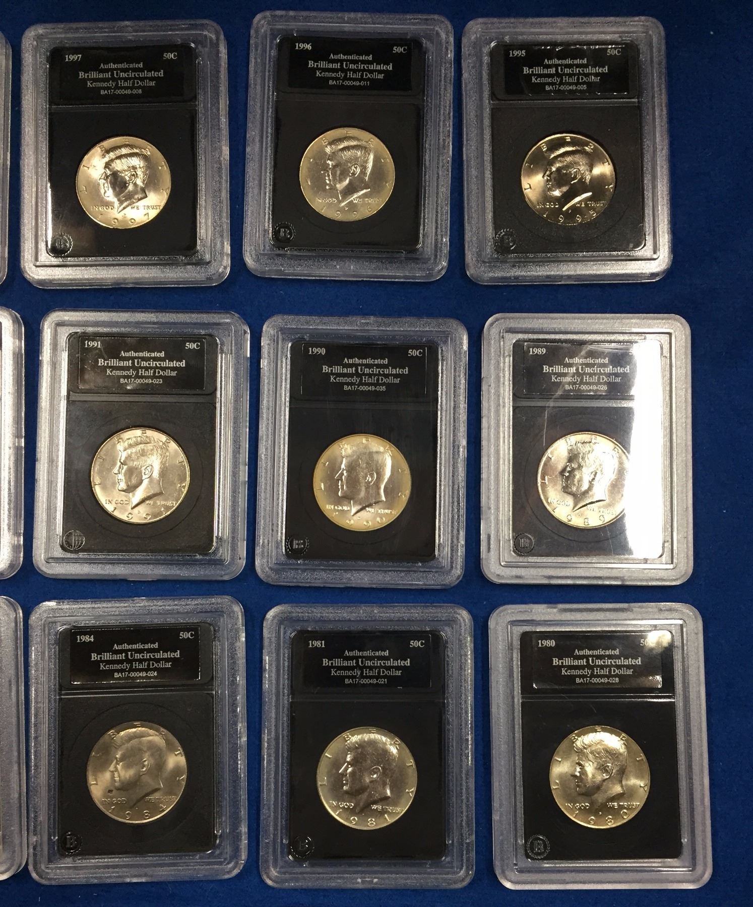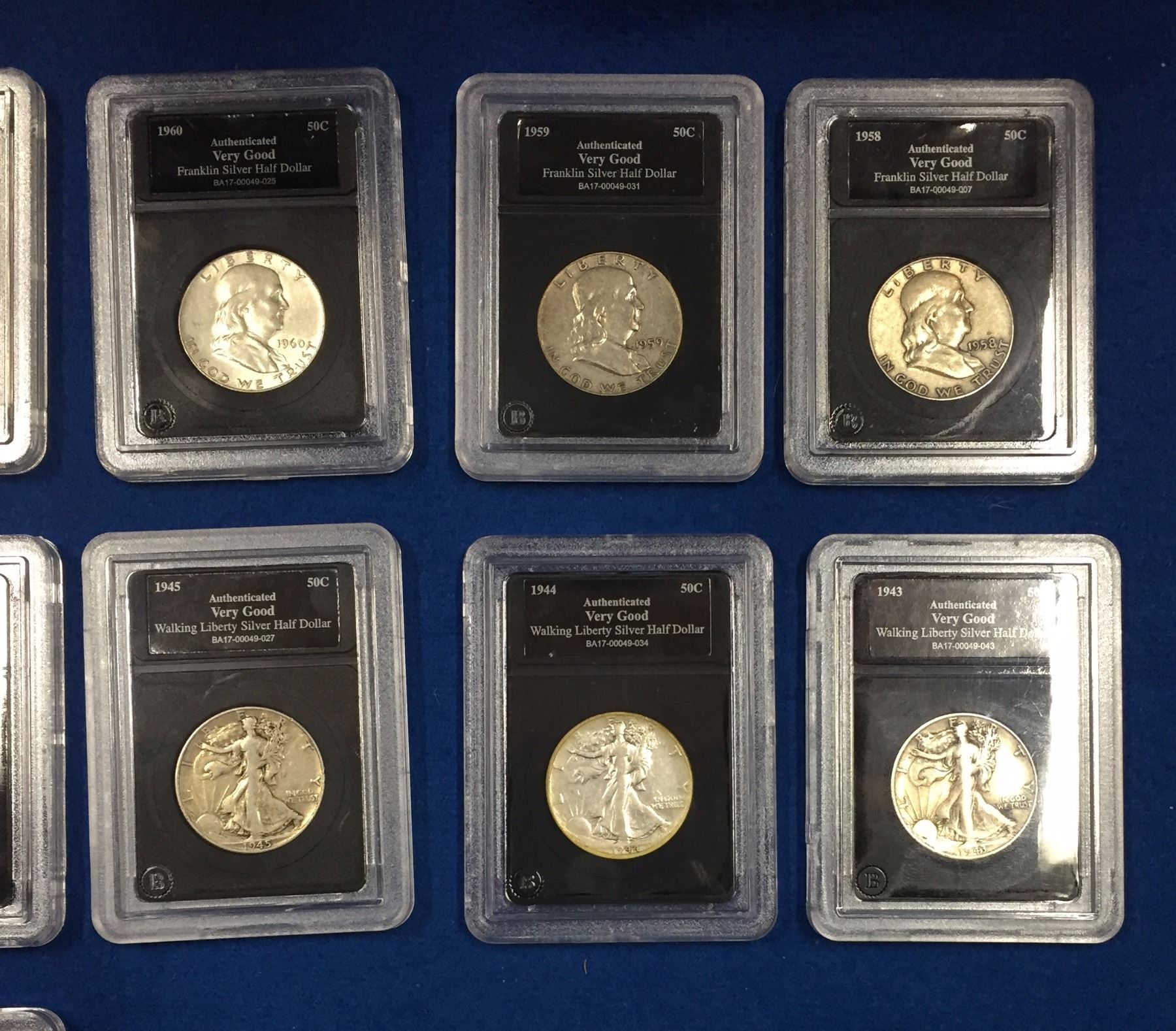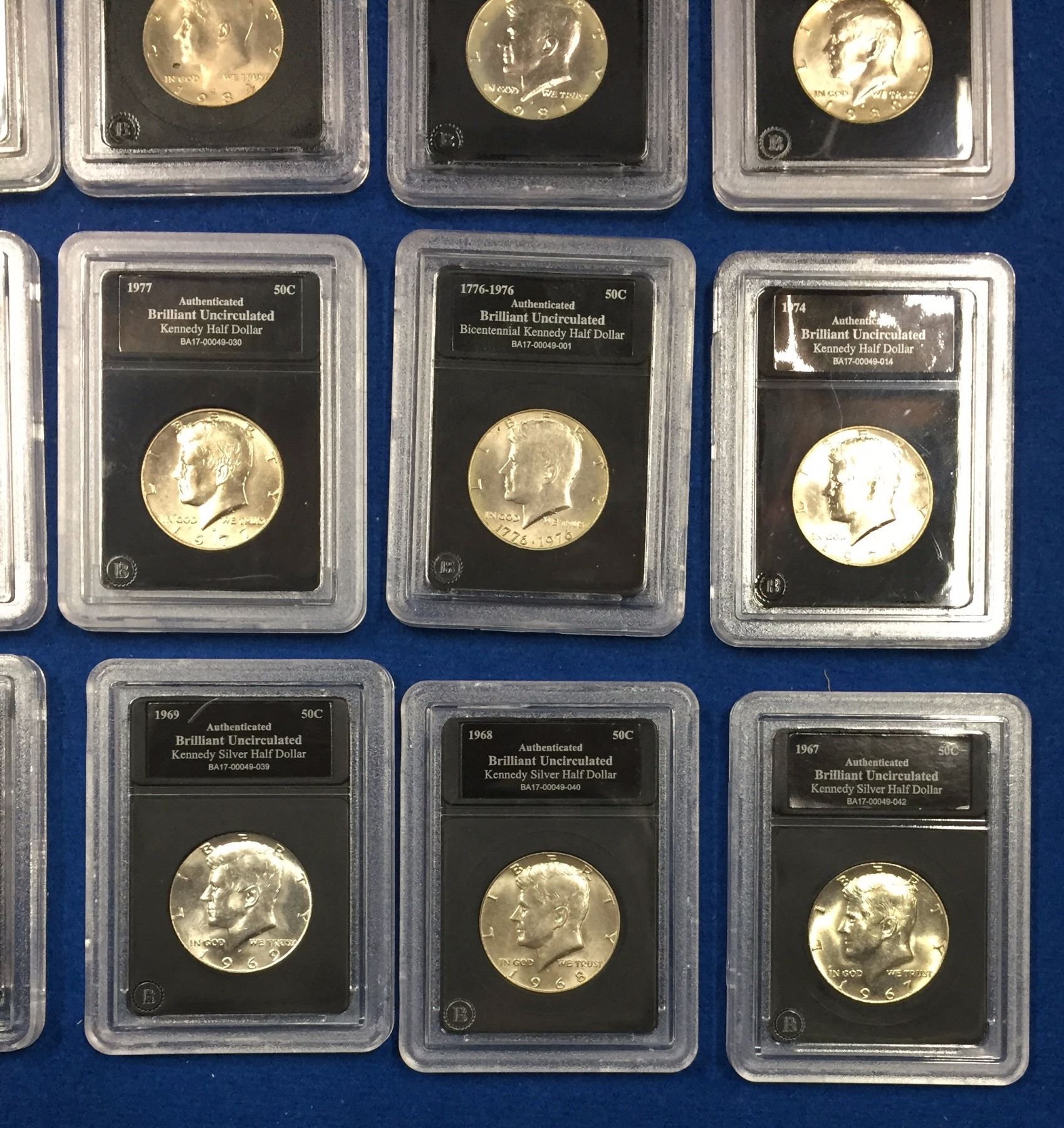 United States 1907 to 2000, 50 Cent Collection. Includes 46 coins. 19 are silver. All coins sealed in capsules. Coin collection is presented in a wooden display case.