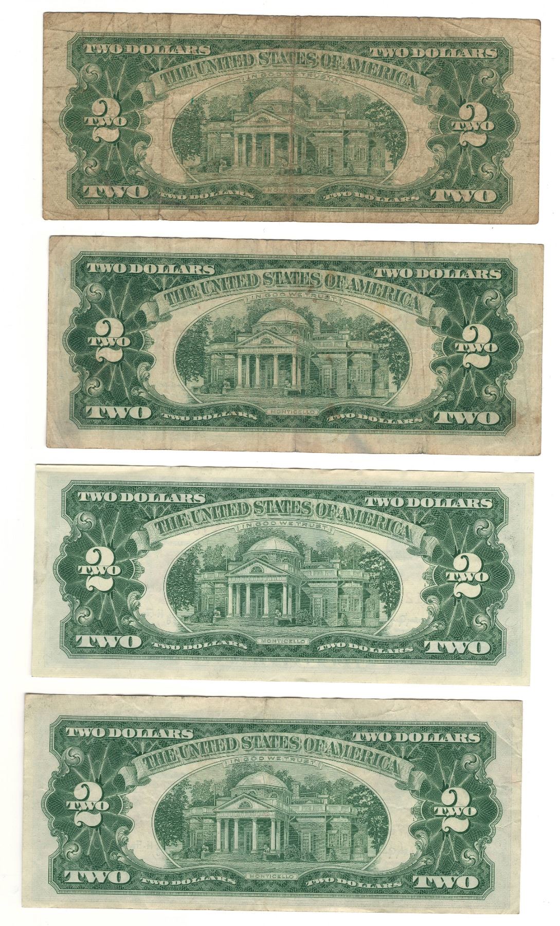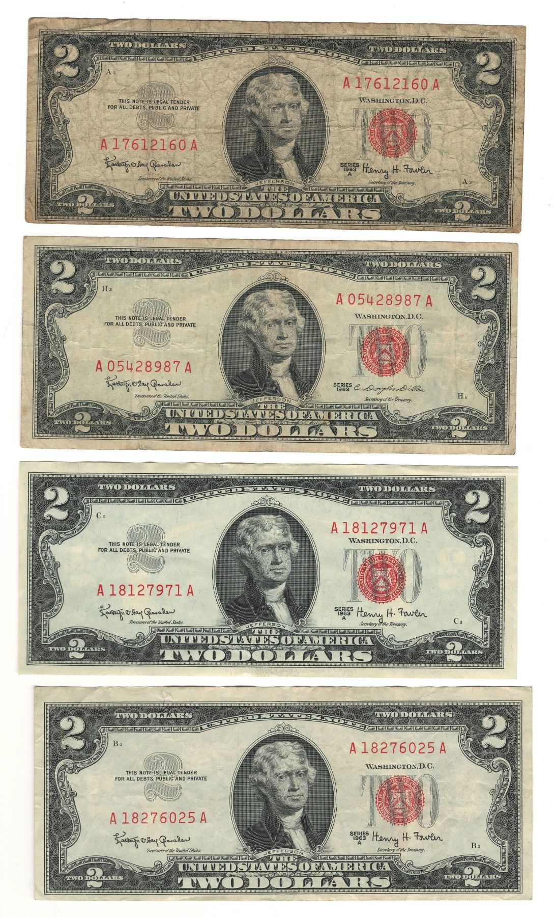 United States 1963 $2 Red Seal Banknotes. Lot of 4.