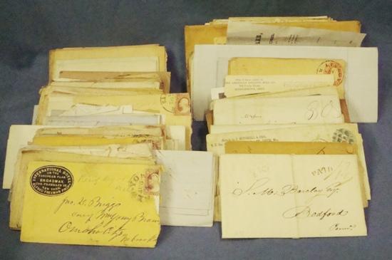 Useful lot of about 50+ covers and folded letters, mostly 1840-1870 era with a few later. Some better stampless, some have the stamps removed. Others with good postal markings. Needs a worthwhile review. Est.$125-175