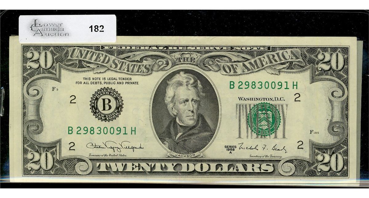 United States; 20 dollars notes 2004, Marin Snow, EB29230902C & EB29230903C both AU. 20 dollars notes 1988A, Villalpando Brady, New York,B29830091H & B29830092H both Choice UNC. Lot of 4 notes.