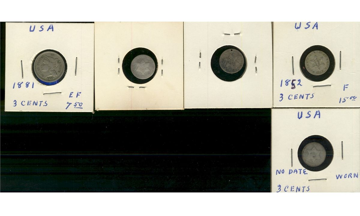 United States; 3 Cents 1852, 1862, 1863, 1881 and 1 issue with no date. Fair to F-15