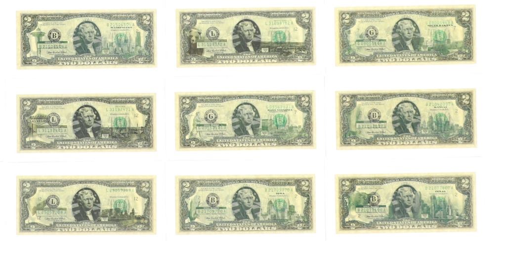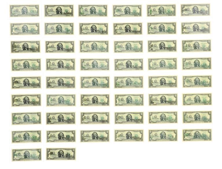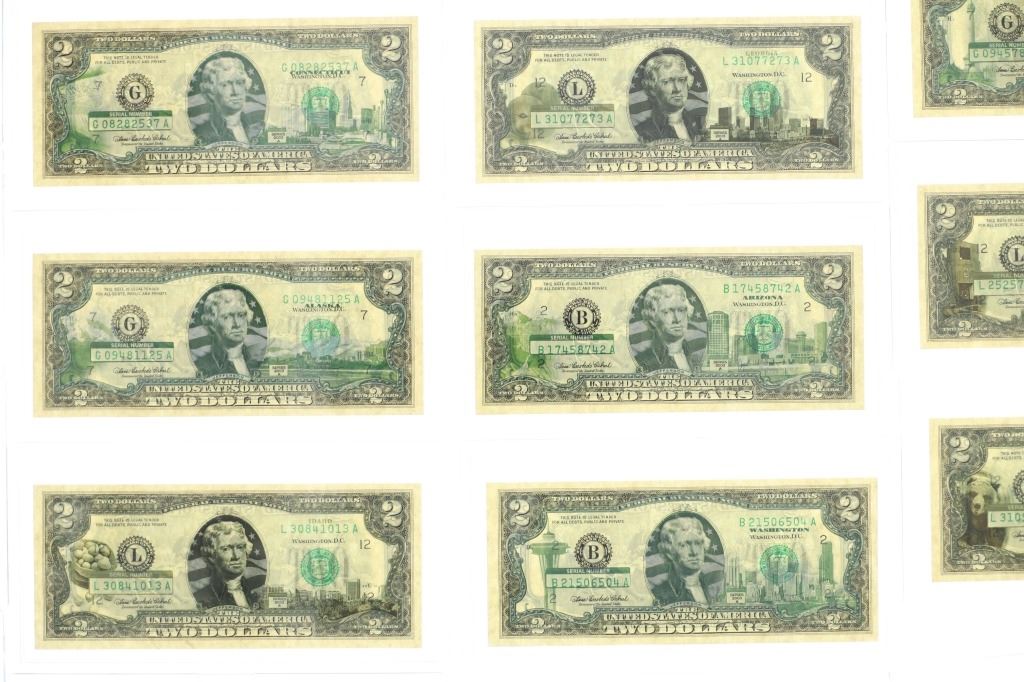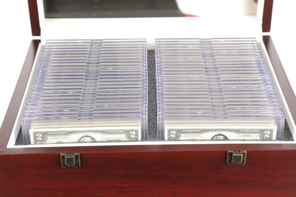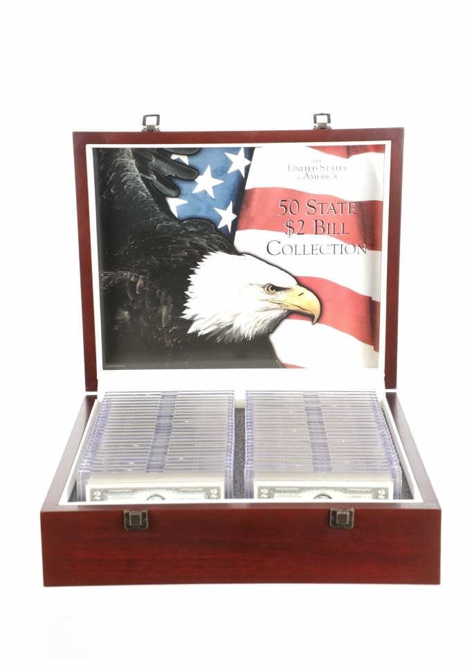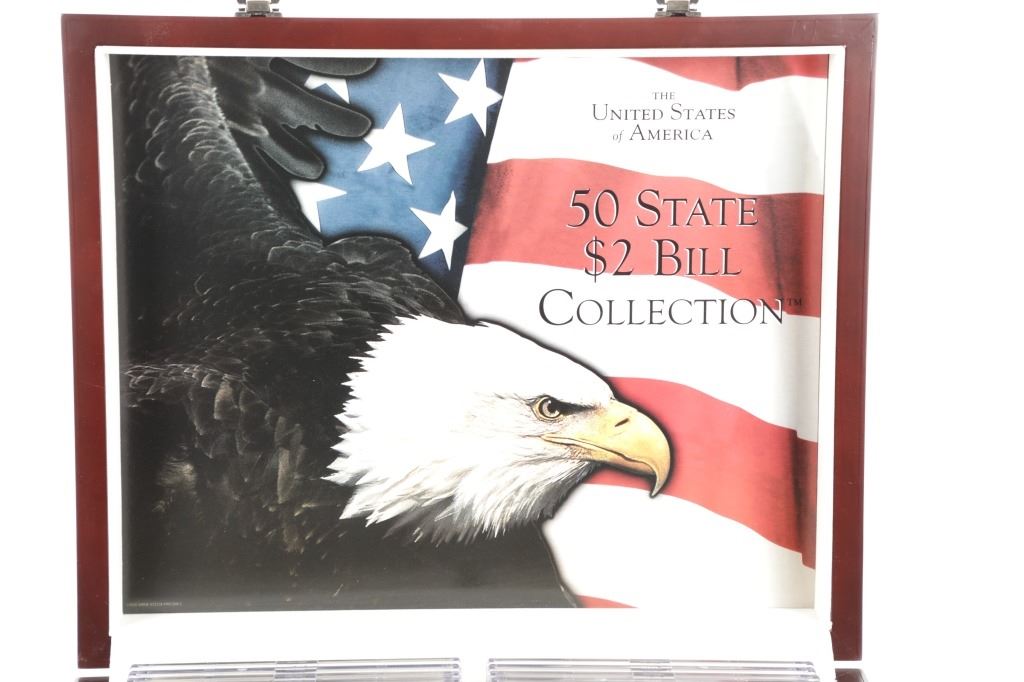 For your consideration is this amazing collection of United States 50 state $2 dollar bills circa 2003. The bills included in this collection are uncirculated and are set in a plastic slab case to preserve their condition. The set includes 50 two dollar bills, all with various illustrations to match the state they are representing. For example, the Montana two dollar bill features a grizzley bear on the left side, while the right side shows what appears to be the city of Billings. The bills are set in slots with twenty-five on the right and twenty-five on the left. When the lid is opened, it shows a bald eagle and american flag graphic and reads, "The United States of America 50 State $2 Bill Collection ™". The collection is set in a beautiful faux mahogany wood box which features two metal latches on the front to securely close the box. The bills and box show good condition overall with little to no wear present and no signs of damage noted. The slab case bills measure 3 3/4" L x 7" W x 1/4" D, while the box measures 14 3/4" L x 17 1/4" W x 5 3/8" H. It weighs 18 pounds and 10 ounces.