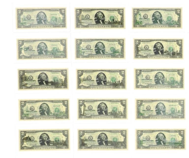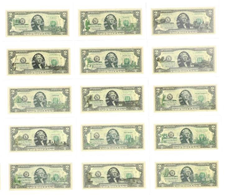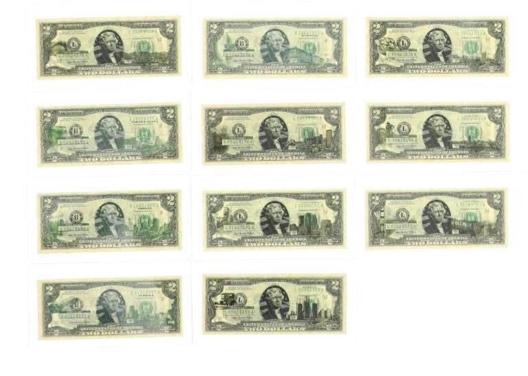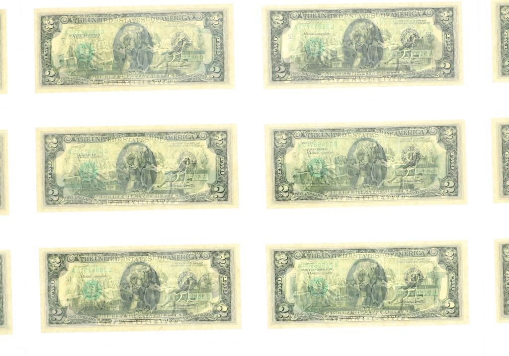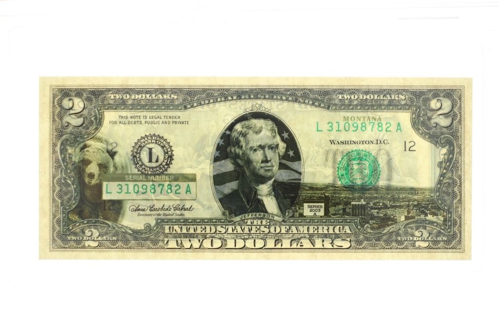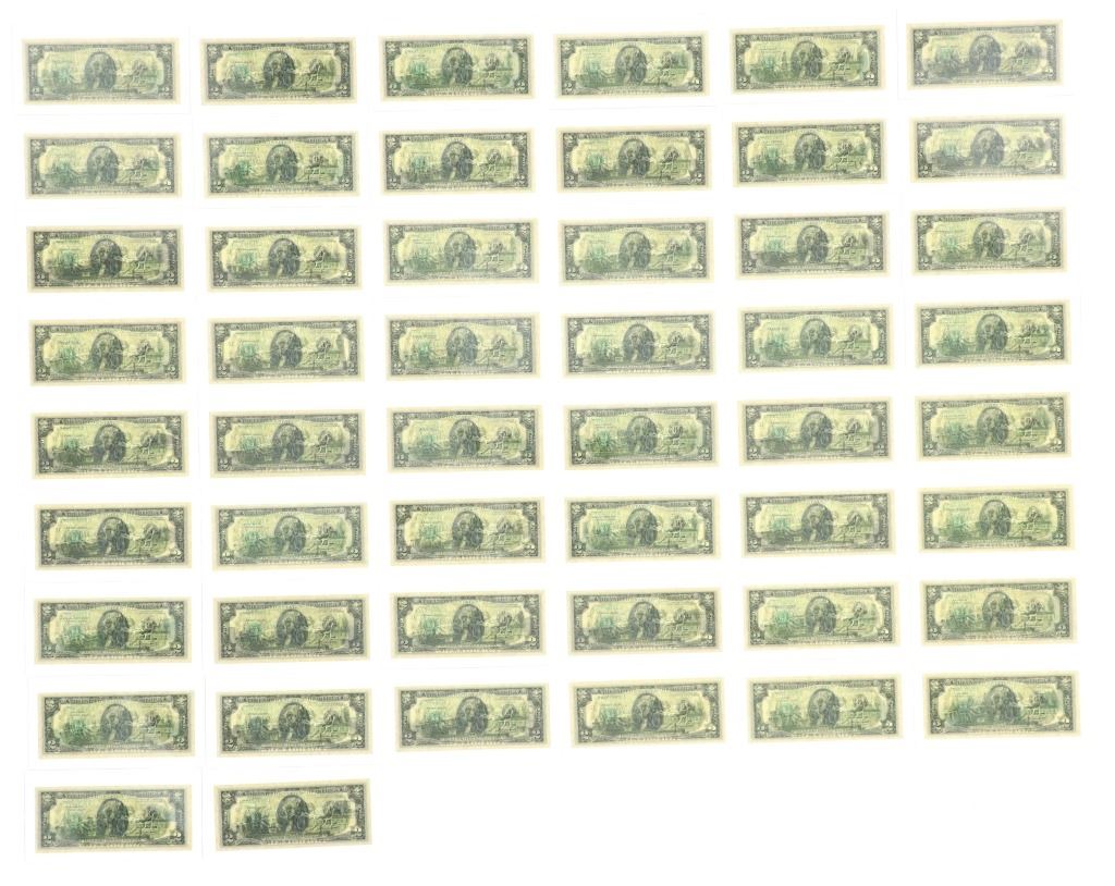 For your consideration is this amazing collection of United States 50 state $2 dollar bills circa 2003. The bills included in this collection are uncirculated and are set in a plastic slab case to preserve their condition. The set includes 50 two dollar bills, all with various illustrations to match the state they are representing. For example, the Montana two dollar bill features a grizzley bear on the left side, while the right side shows what appears to be the city of Billings. The bills are set in slots with twenty-five on the right and twenty-five on the left. When the lid is opened, it shows a bald eagle and american flag graphic and reads, "The United States of America 50 State $2 Bill Collection ™". The collection is set in a beautiful faux mahogany wood box which features two metal latches on the front to securely close the box. The bills and box show good condition overall with little to no wear present and no signs of damage noted. The slab case bills measure 3 3/4" L x 7" W x 1/4" D, while the box measures 14 3/4" L x 17 1/4" W x 5 3/8" H. It weighs 18 pounds and 10 ounces.