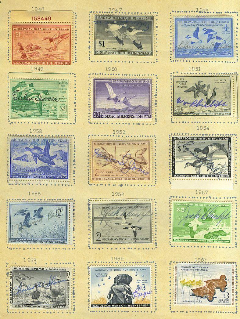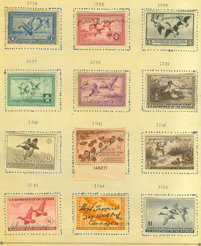 The first (27)federal duck stamps, nearly all used and hinged mounted on a couple of homemade pages. Generally sound and useful but some faults are present. Needs review. Est.$200-300