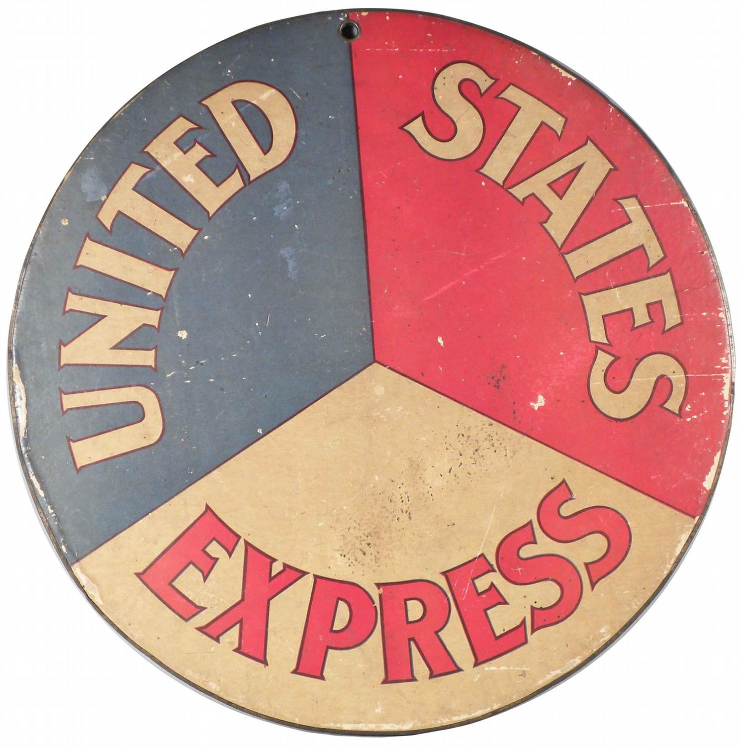 United States Express Hardboard Calling Card, two sided. Some scuffs and discoloration on both sides, a couple of minor paint drips on back side otherwise good condition. 14 1/8 inch diameter in metal holder.