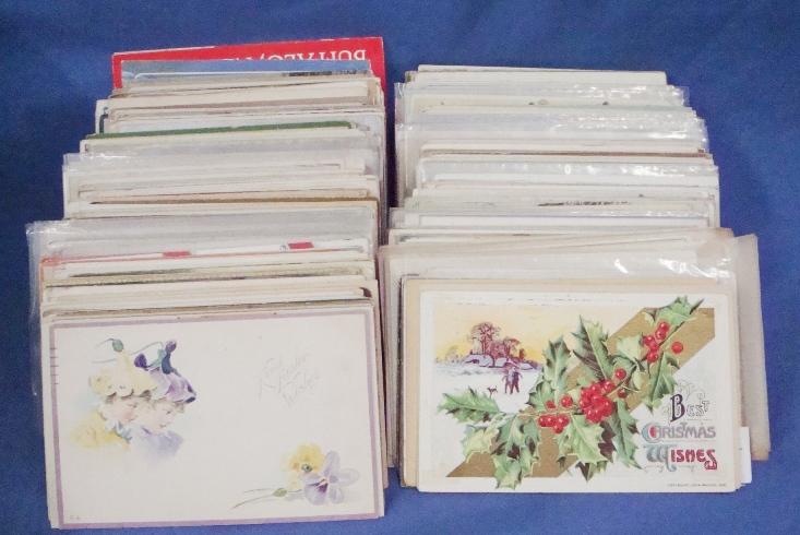 Useful lot of a few (100)postcards, all holiday greeting type cards with Valentine, Christmas, Thanksgiving, Easter, New Year's etc. Wide range here with many $1-5 cards. Est.$65-90