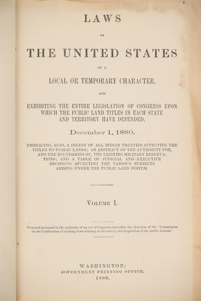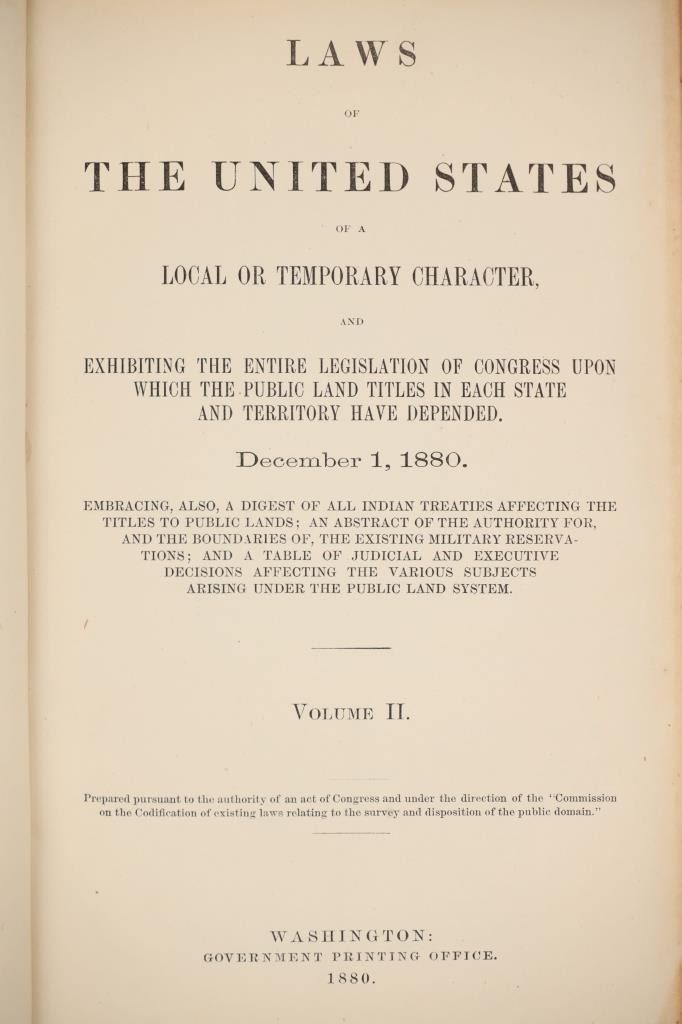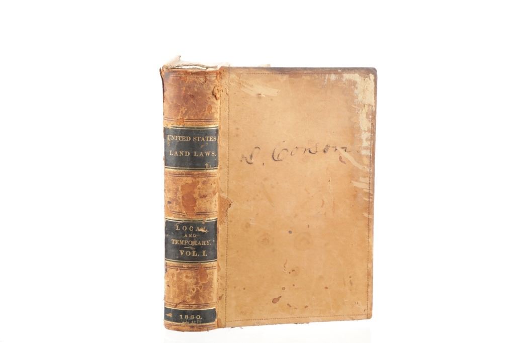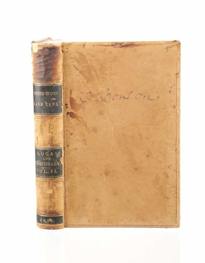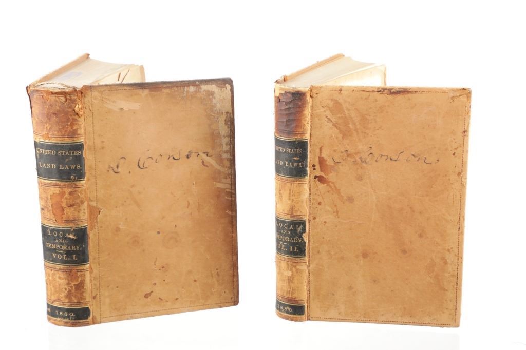 Featured in this lot is a Rare "United States Land Laws Local and Temporary", 1880, Two (2) Volumes. "Laws of The United States of a Local OR Temporary Character and Exhibiting The Entire Legislation Of Congress Upon Which The Public Land Titles In Each State And Territory Have Depended. December 1, 1880. Embracing, Also, A Digest Of All Indian Treaties Affecting The Titles To Public Lands; An Abstract Of The Authority For, And The Boundaries Of, The Existing Military Reservations; And A Table Of Judicial And Executive Decisions Affecting The Various Subjects Arising Under The Public Land System. Prepared pursuant to the authority of an act of Congress and under the direction of the "Commission on the Codification of existing laws relating to the survey and disposition of the public domain" Washington: Government Printing Office. 1880. Of particular note, are the land laws for the territories of Arizona, Dakota, Idaho, Indian, Montana, New Mexico, Utah, Washington, and Wyoming. Also included is a "Digest of Indian Treaties". A magnificent reference on the validity of land titles in 1880 during the westward expansion of the United States. Two volumes bound in leather, age tanning exhibited throughout, minimal foxing noted. Covers of both volumes exhibit scuffing. Volume I measures 9"L x 6"W x 1.75"D, Volume II is 9"L x 6"W x 1.5"D with the total weight being 4lb 14oz.*