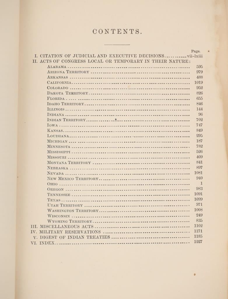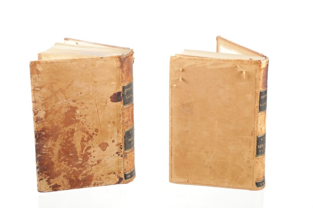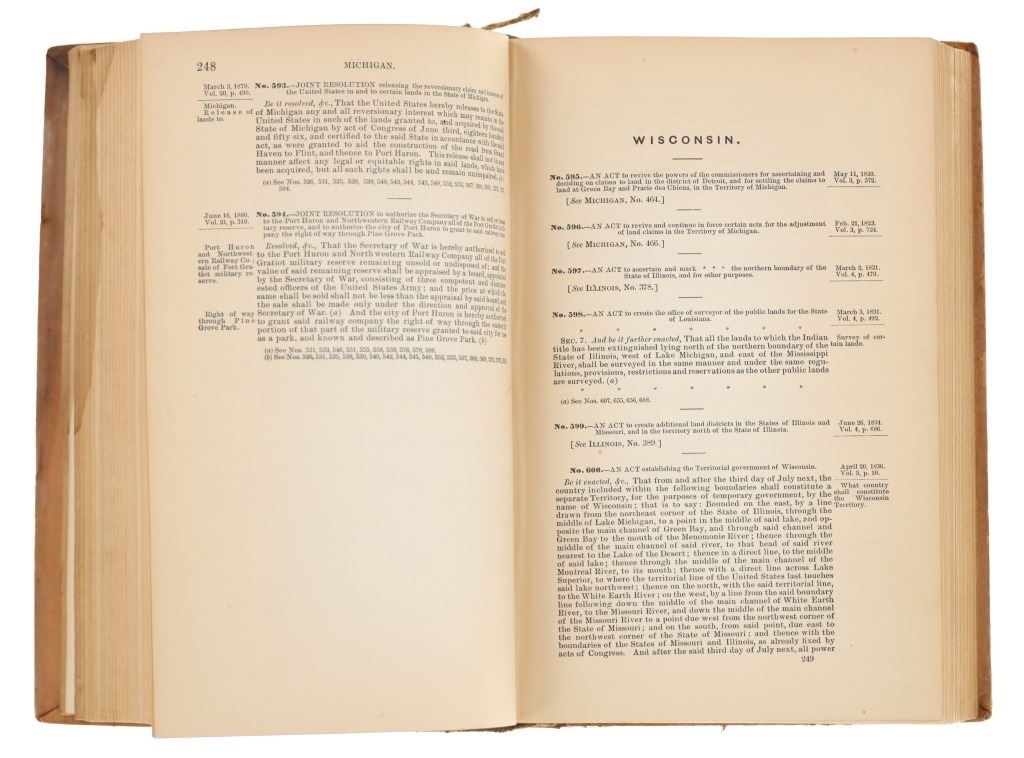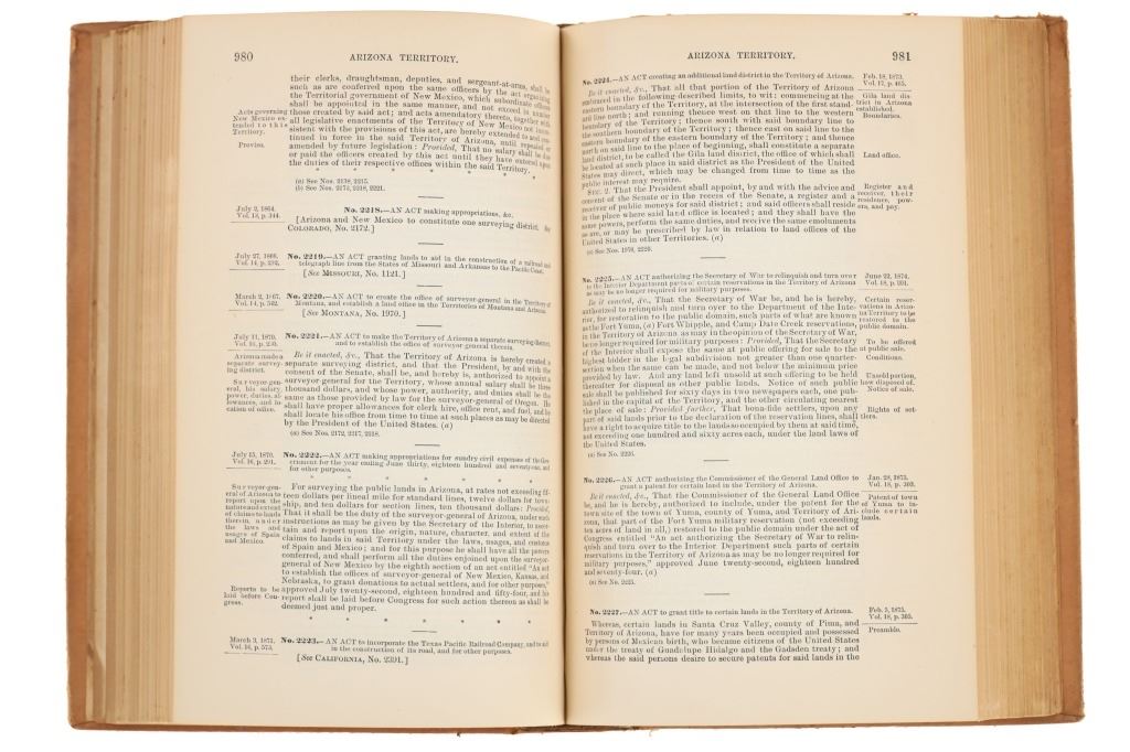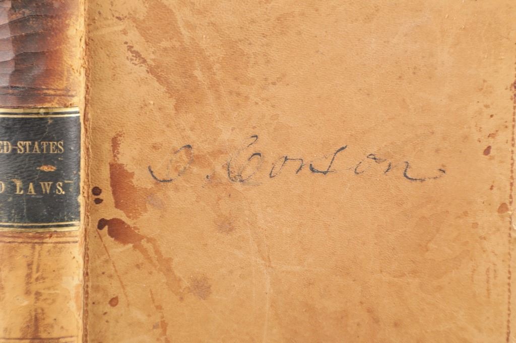 Featured in this lot is a Rare "United States Land Laws Local and Temporary", 1880, Two (2) Volumes. "Laws of The United States of a Local OR Temporary Character and Exhibiting The Entire Legislation Of Congress Upon Which The Public Land Titles In Each State And Territory Have Depended. December 1, 1880. Embracing, Also, A Digest Of All Indian Treaties Affecting The Titles To Public Lands; An Abstract Of The Authority For, And The Boundaries Of, The Existing Military Reservations; And A Table Of Judicial And Executive Decisions Affecting The Various Subjects Arising Under The Public Land System. Prepared pursuant to the authority of an act of Congress and under the direction of the "Commission on the Codification of existing laws relating to the survey and disposition of the public domain" Washington: Government Printing Office. 1880. Of particular note, are the land laws for the territories of Arizona, Dakota, Idaho, Indian, Montana, New Mexico, Utah, Washington, and Wyoming. Also included is a "Digest of Indian Treaties". A magnificent reference on the validity of land titles in 1880 during the westward expansion of the United States. Two volumes bound in leather, age tanning exhibited throughout, minimal foxing noted. Covers of both volumes exhibit scuffing. Volume I measures 9"L x 6"W x 1.75"D, Volume II is 9"L x 6"W x 1.5"D with the total weight being 4lb 14oz.*