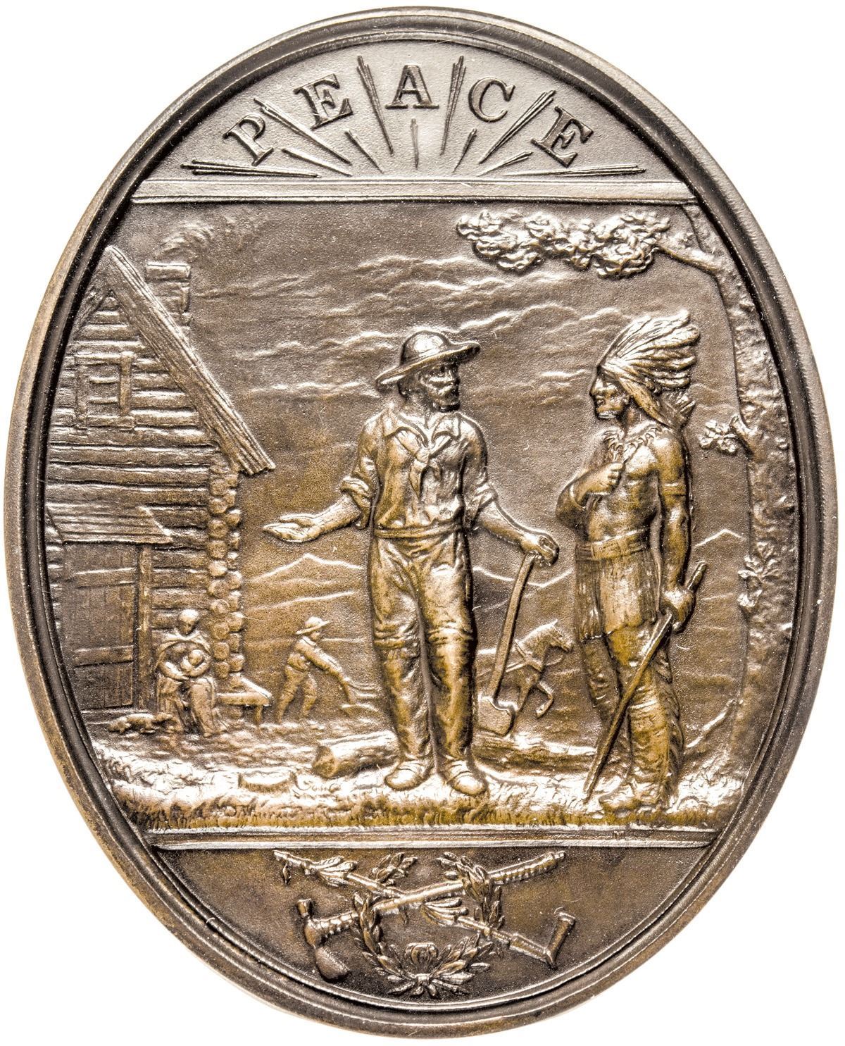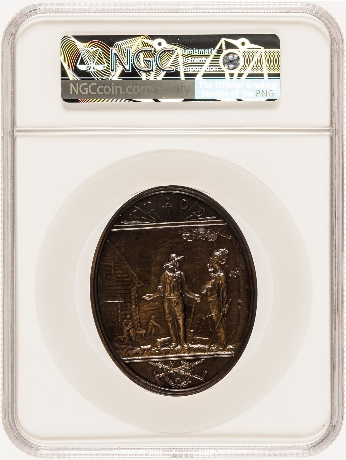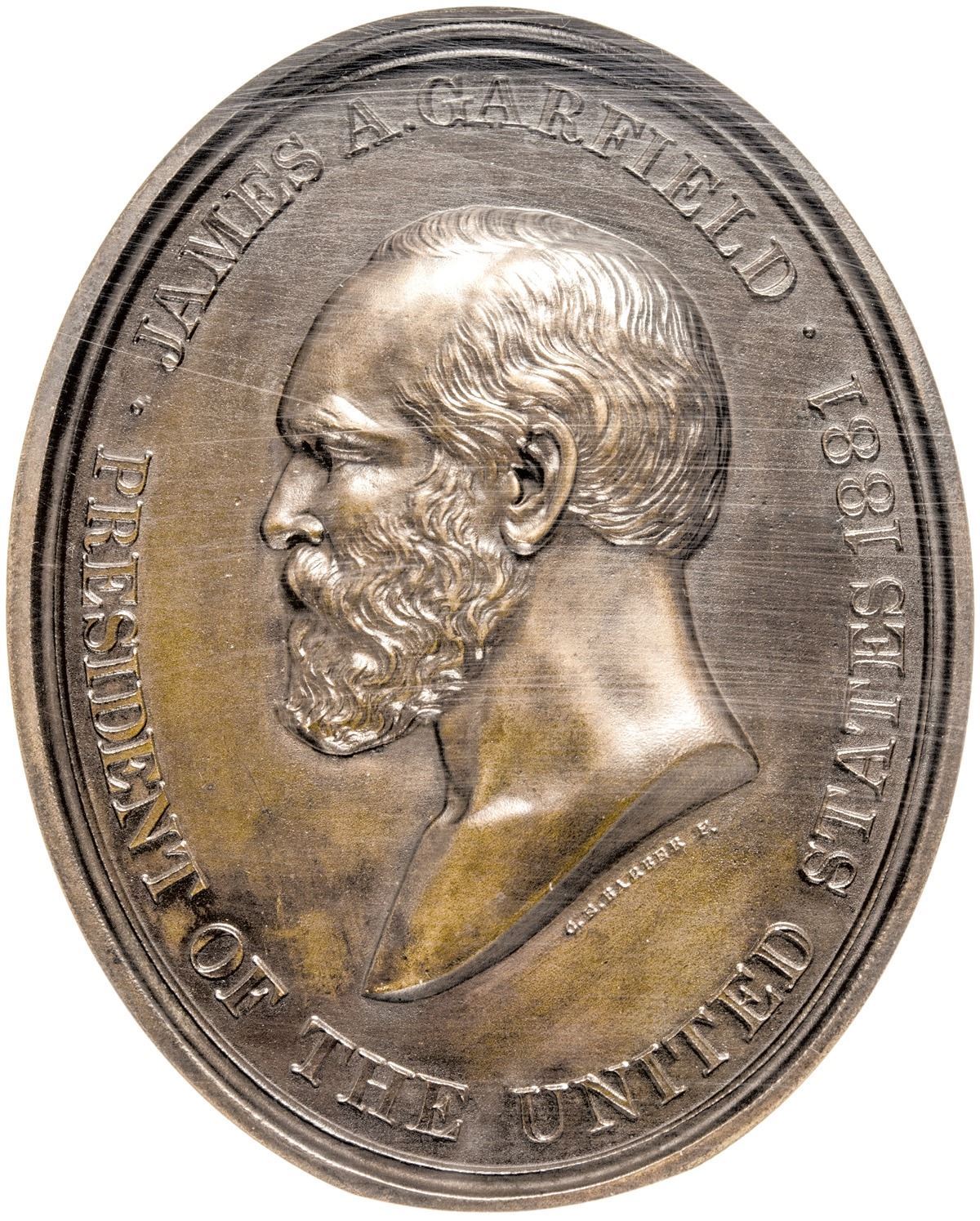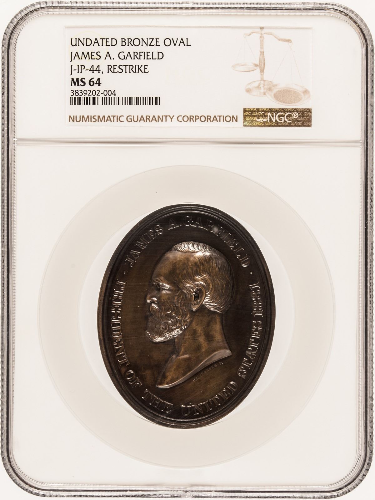 Description: 74 mm x 59 mm. Dies as illustrated. Here is an exceptional medal in near-Gem condition, with superb high-relief detail and nicely preserved surfaces. This type has always proven popular owing to the oval shape and the fact that Garfield was assassinated. Originals of this type have always been very rare, causing the Mint to strike additional pieces in later years to satisfy collector demand. This is an early Restrike as indicated by the reddish-bronze color; later, less-desirable restrikes were made of yellow-bronze. Though dated 1881, the Garfield Indian Peace medals were not completed until 1882 and they continued to be distributed to Native American tribal Chiefs as late as 1884. According to Julian, “This medal was placed on public sale in September, 1883.” Whether the mentioned medals were Originals or Restrikes is unclear. In either event, we have tracked a rare original Bronze Garfield Indian Peace Medal which sold for $5,000 in 2016. Housed in an oversized NGC encapsulation.