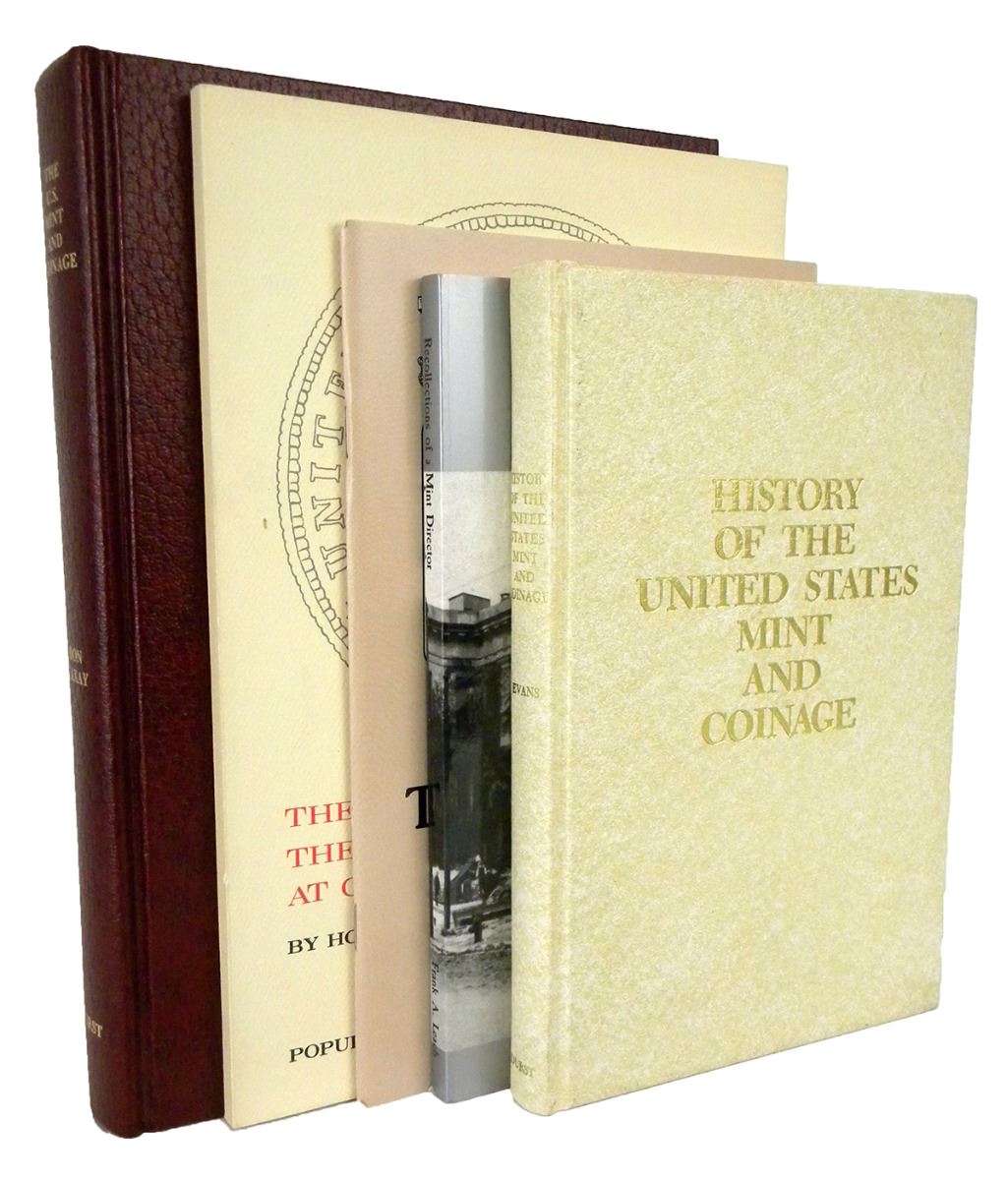 [United States Mint]. FIVE WORKS ON THE U.S. MINTS. Includes: a later reprint of Don Taxay’s The U.S. Mint and Coinage; a later reprint of George Evans’s Illustrated History of the United States Mint; Howard Hickson’s Mint Mark CC; the Bowers & Merena reprint of Frank A. Leach’s Recollections of a Mint Director; and David J. Eitemiller’s Historic Tours: The Denver Mint. Varying formats, the first two being hardcover. Generally fine. Includes some notable works.