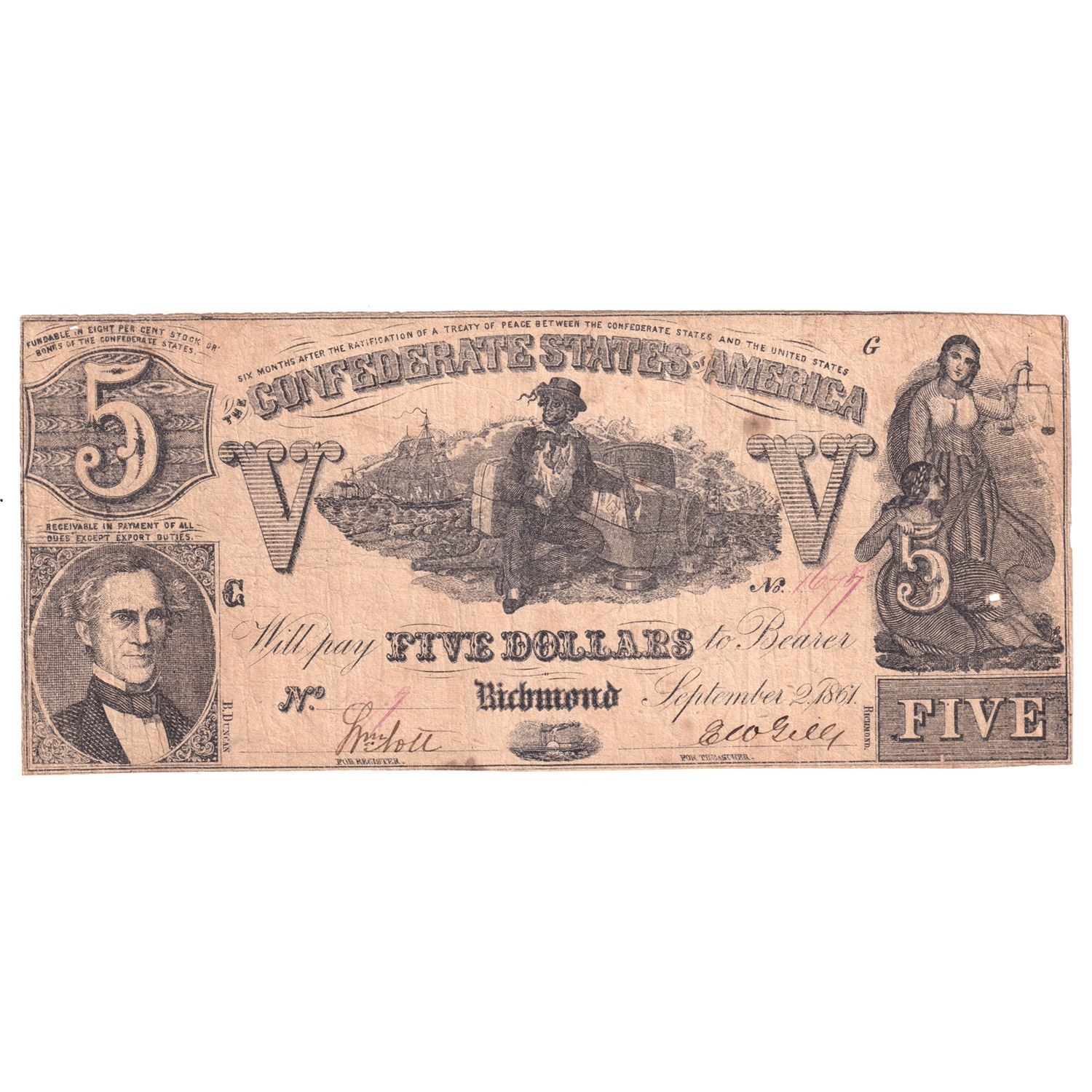 United States Obsolete Banknote CS-37 1861 $5 Confederate States of America, F-VF (pinholes).