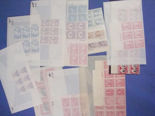 Useful lot of dozens of plate blocks in glassines, many are never hinged. Nice grouping with several better two cent reds, three cent purples, Prexies, decent airs and others. Worth review. Est.$150-250