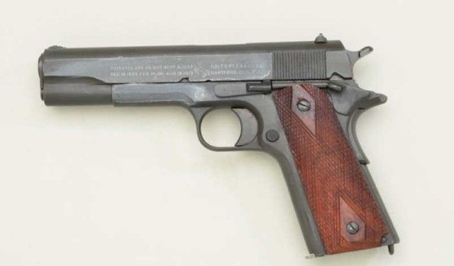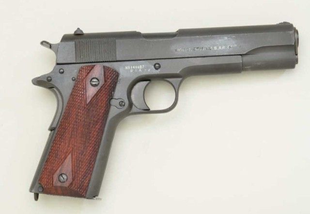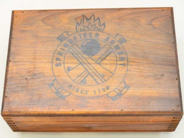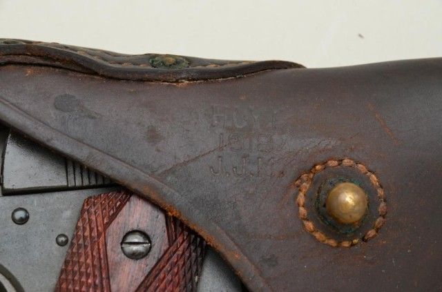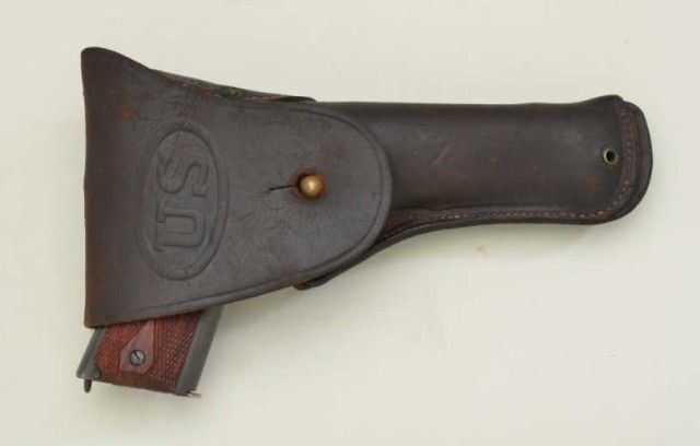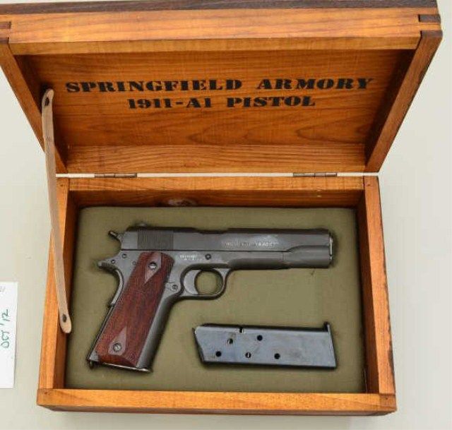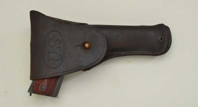 United States Property Colt Model 1911-A1 semi-auto pistol, .45 cal., 5” barrel, re-parkerized finish, checkered wood grips, #148827; in later wood display case marked Springfield Armory with extra latermagazine. This gun is in overall good condition as arsenal re-furbished showing the majority of its parkerized finish, some scattered pin prick pitting, very good bore, crisp action, fine grips; box is overall very good; also accompanied by a US marked military leather flap holster marked “Hoyt 1918” with inspector marks “J.J.M.” in overall good condition. Est.: $750-$1,500.